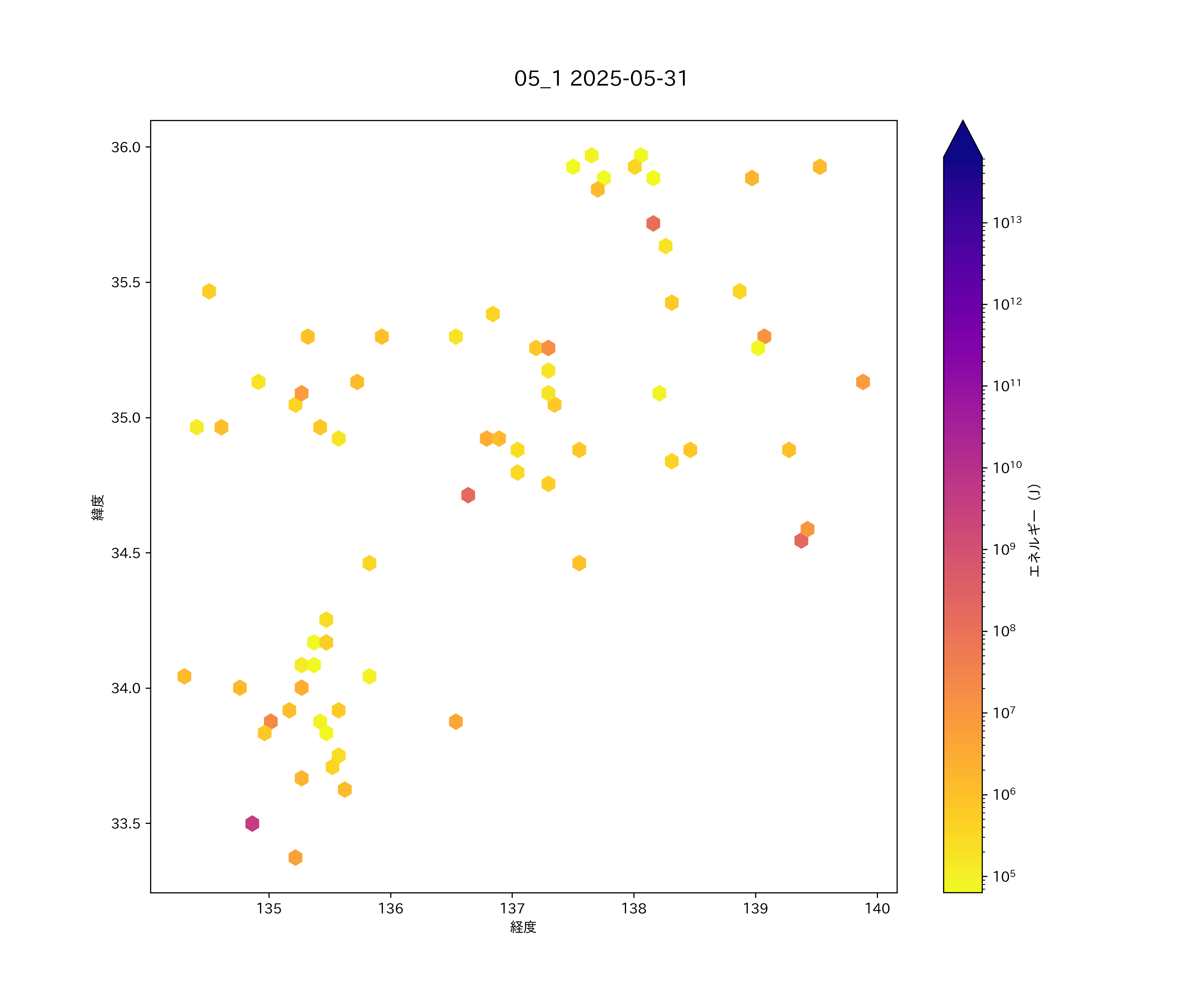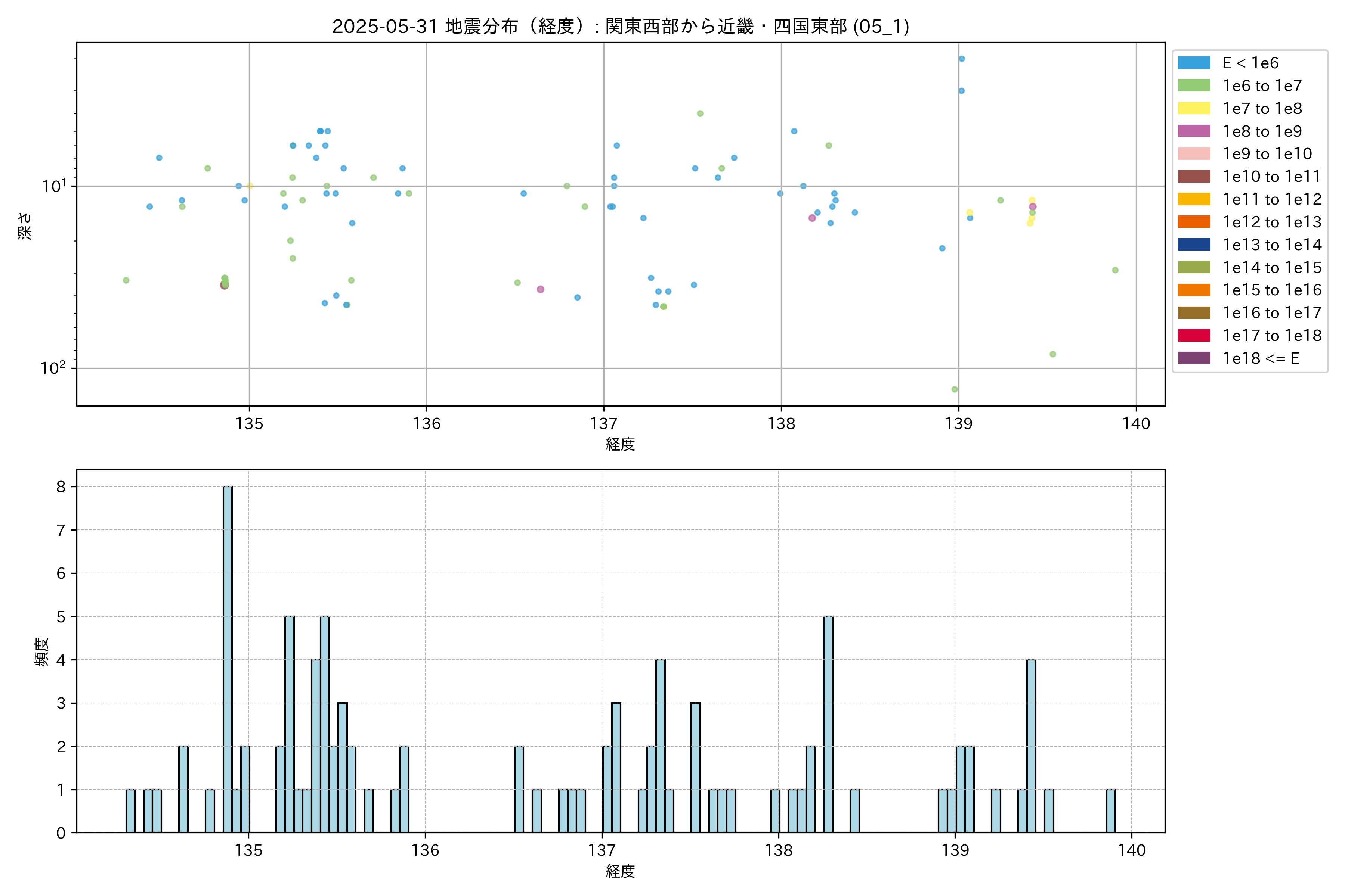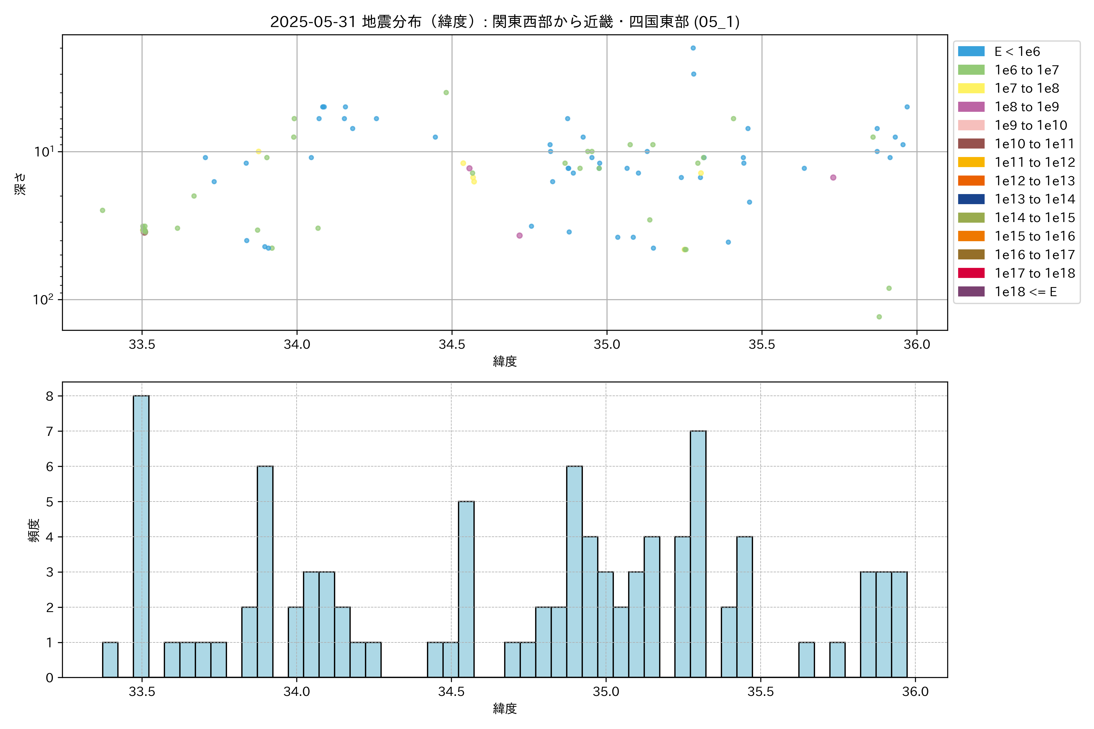 2025年05月31日 関東西部から近畿・四国東部 エリア震源マップ