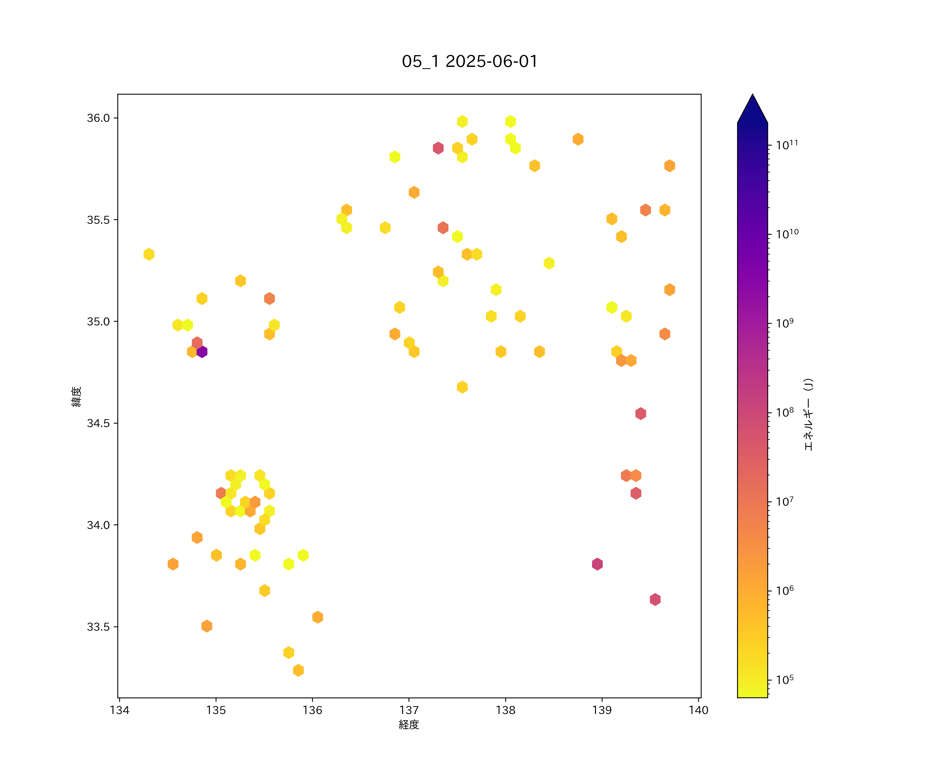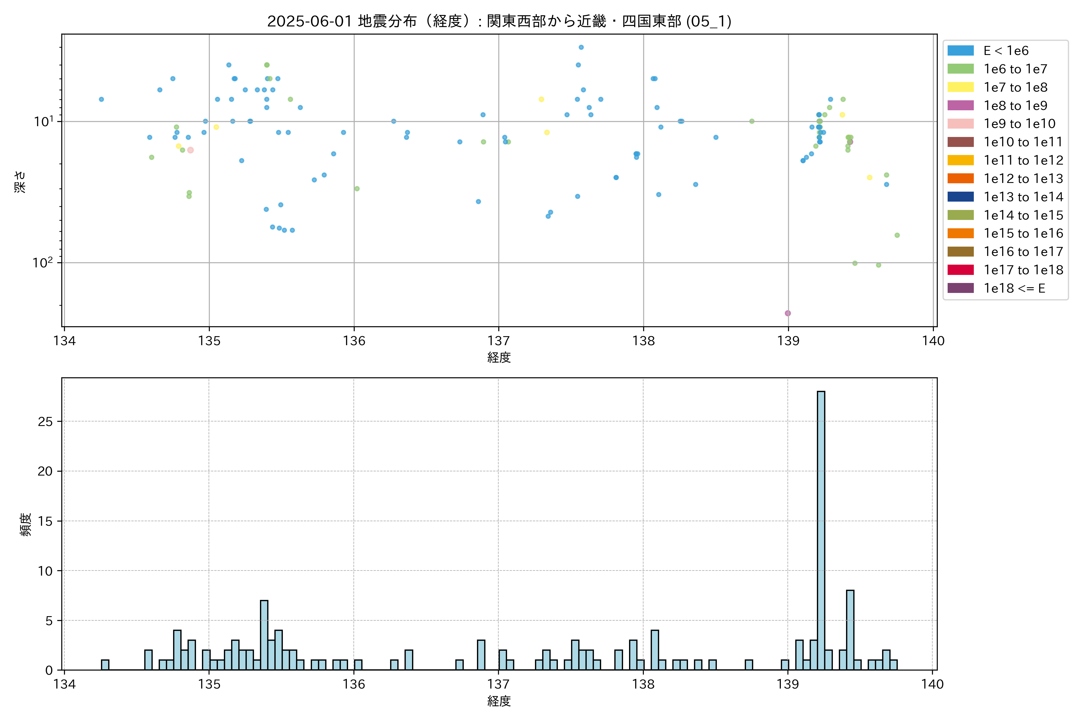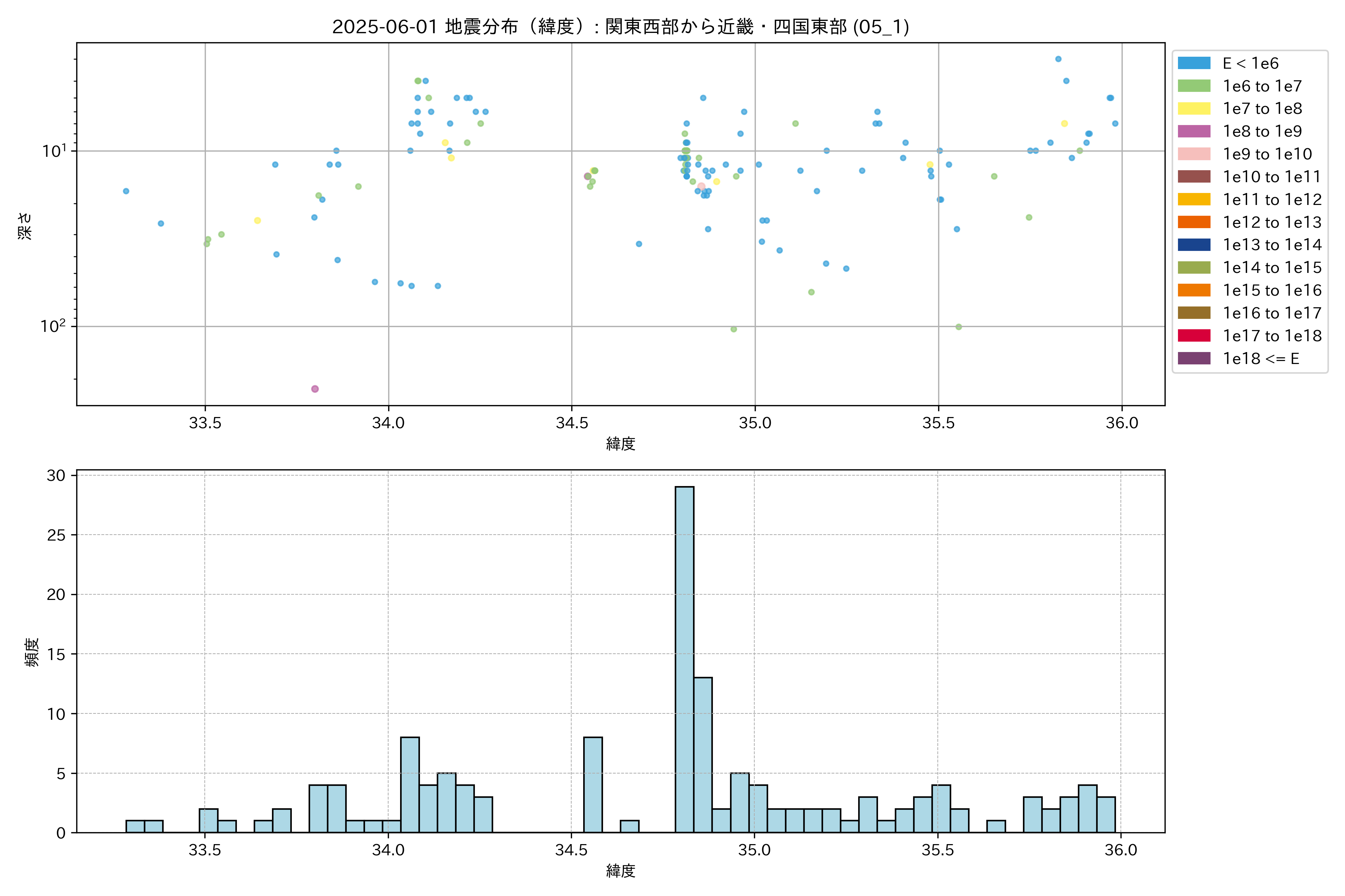 2025年06月01日 関東西部から近畿・四国東部 エリア震源マップ