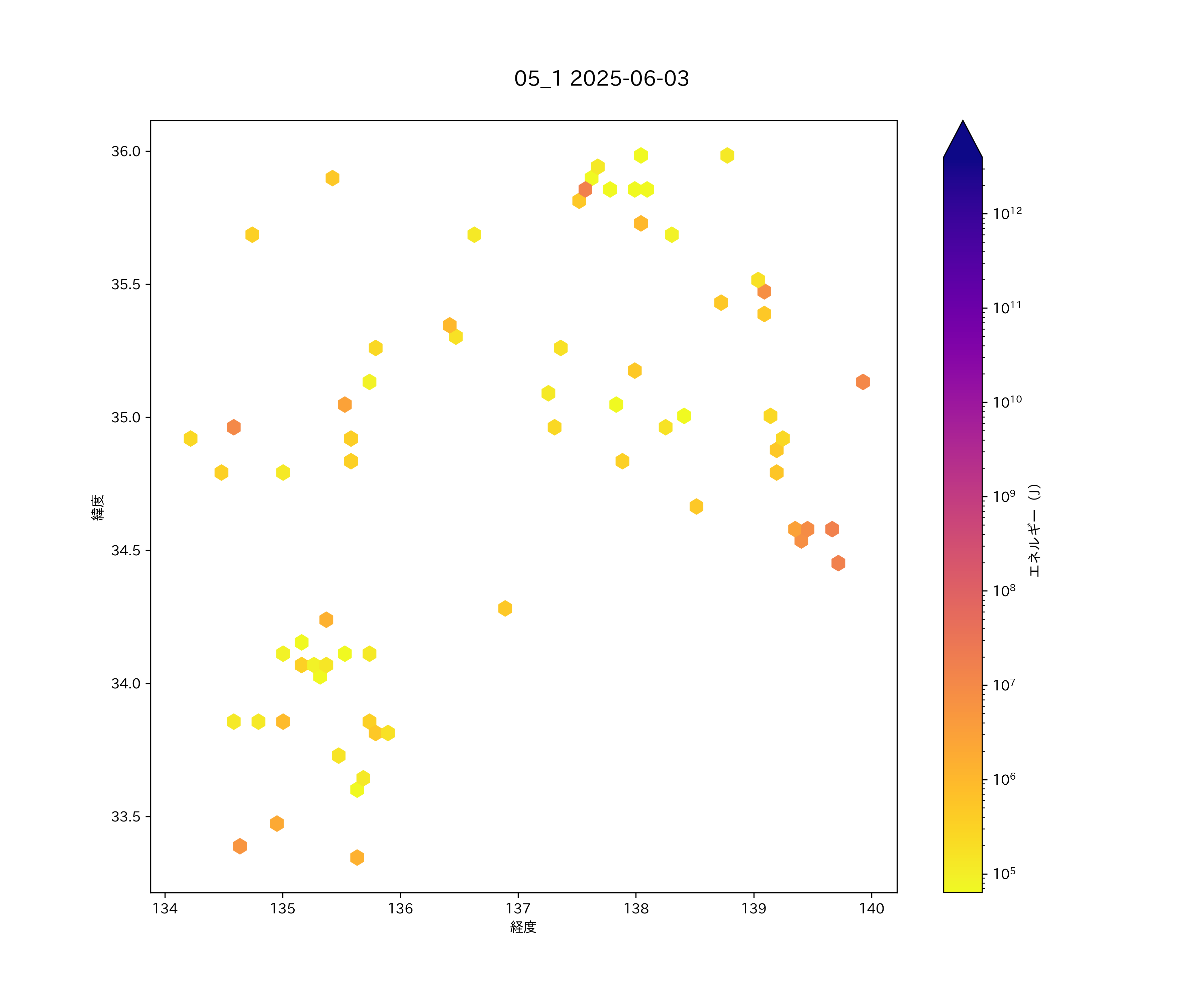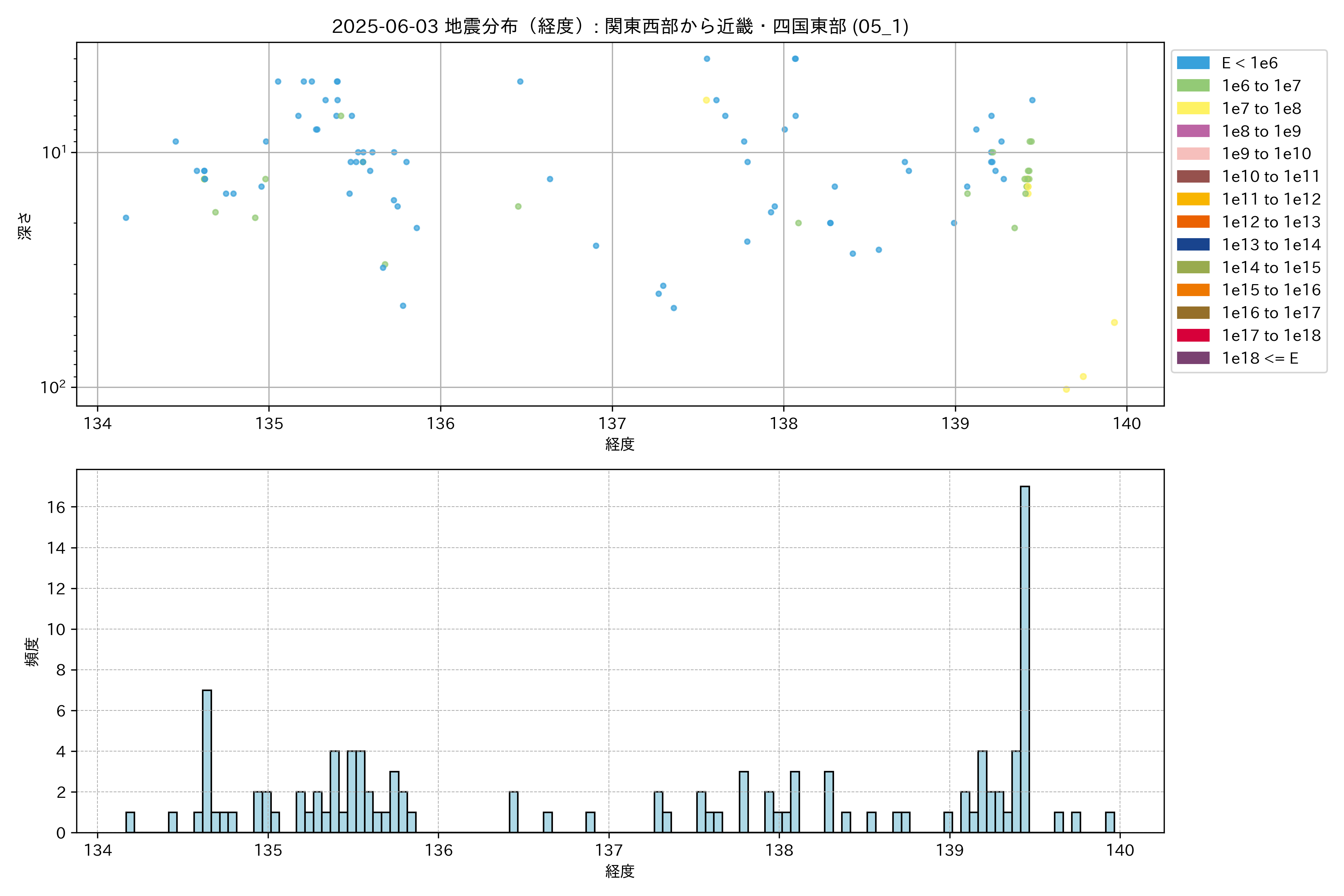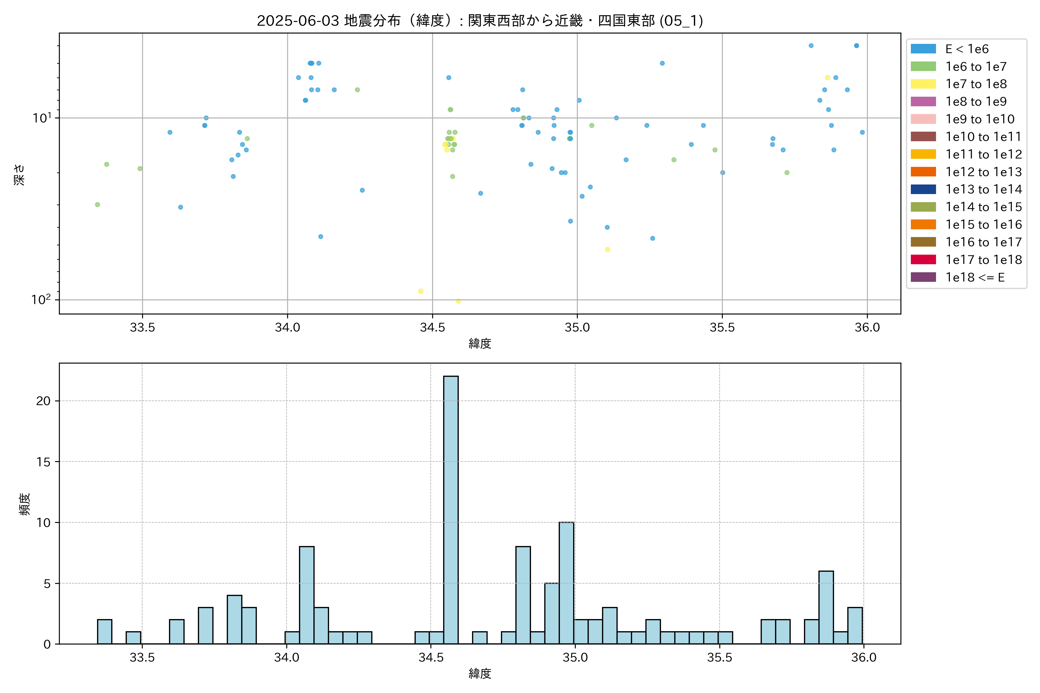 2025年06月03日 関東西部から近畿・四国東部 エリア震源マップ