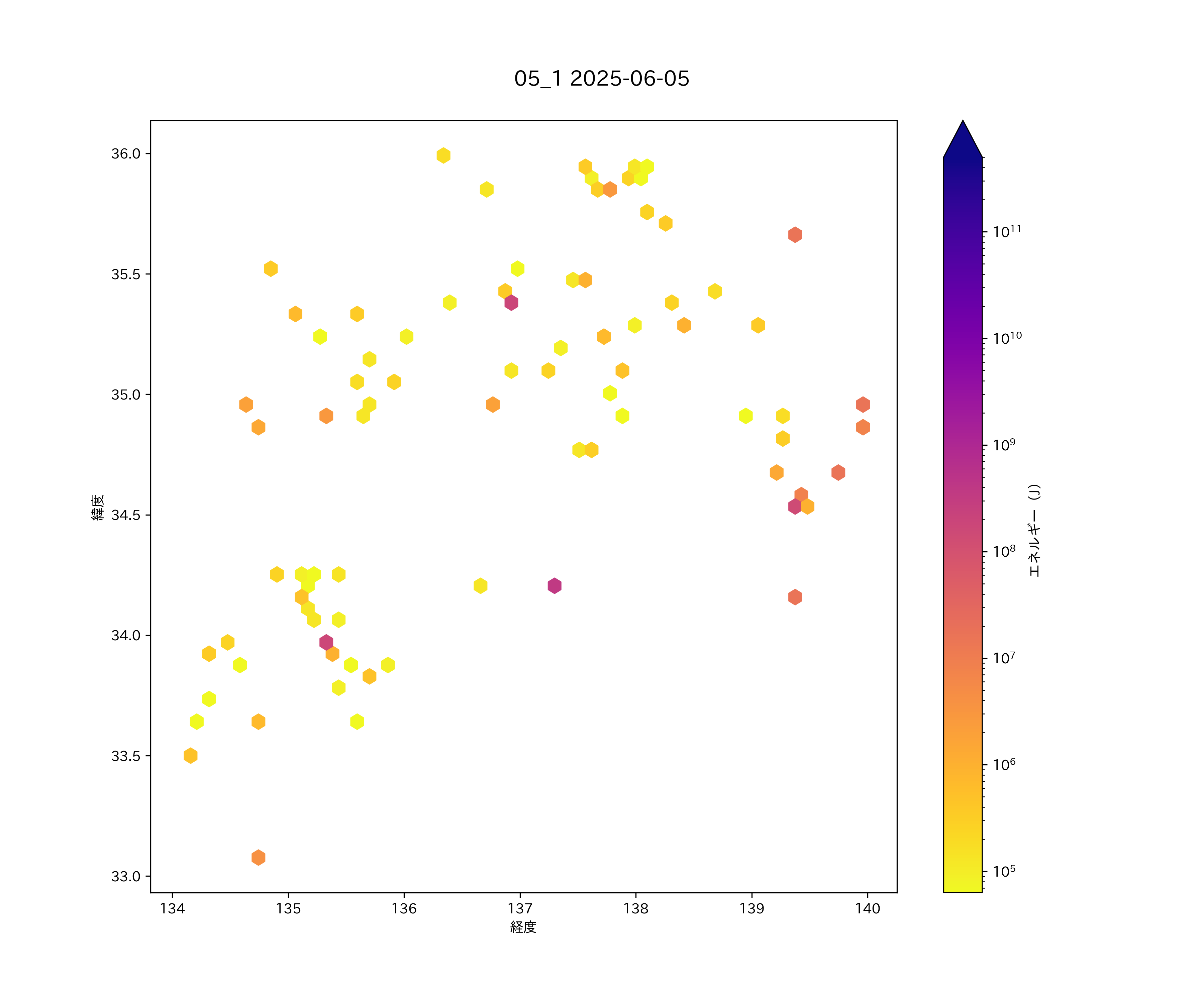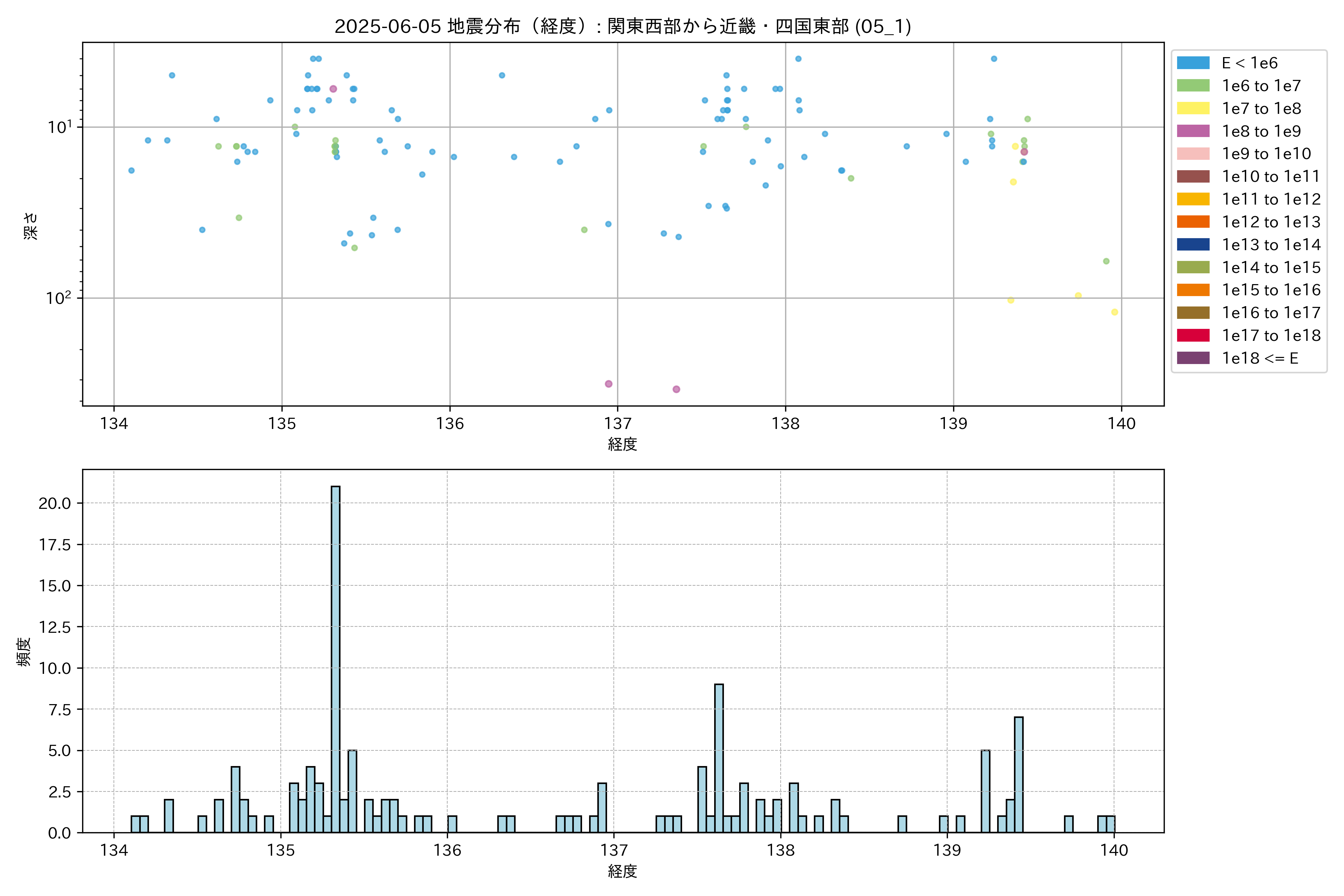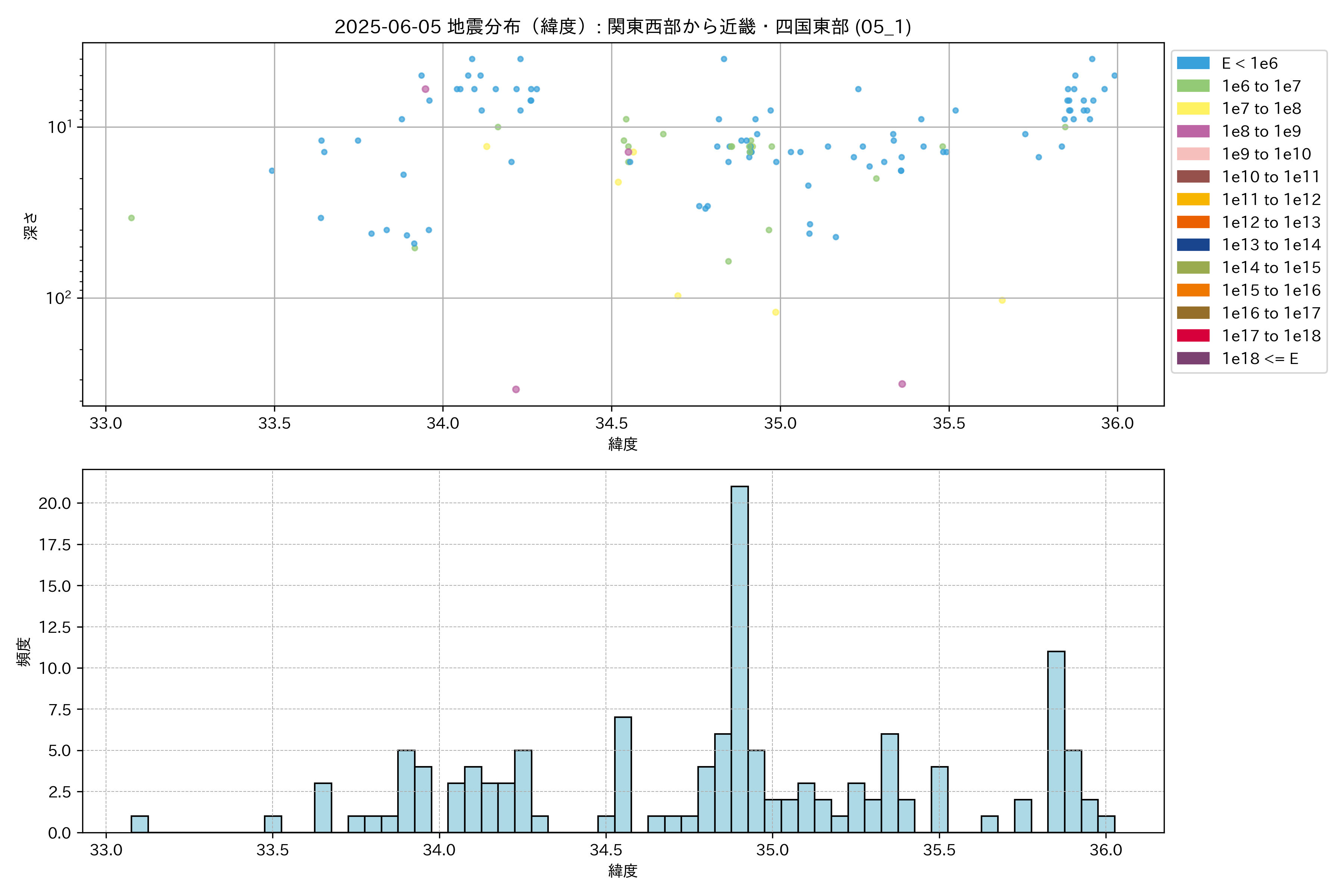 2025年06月05日 関東西部から近畿・四国東部 エリア震源マップ