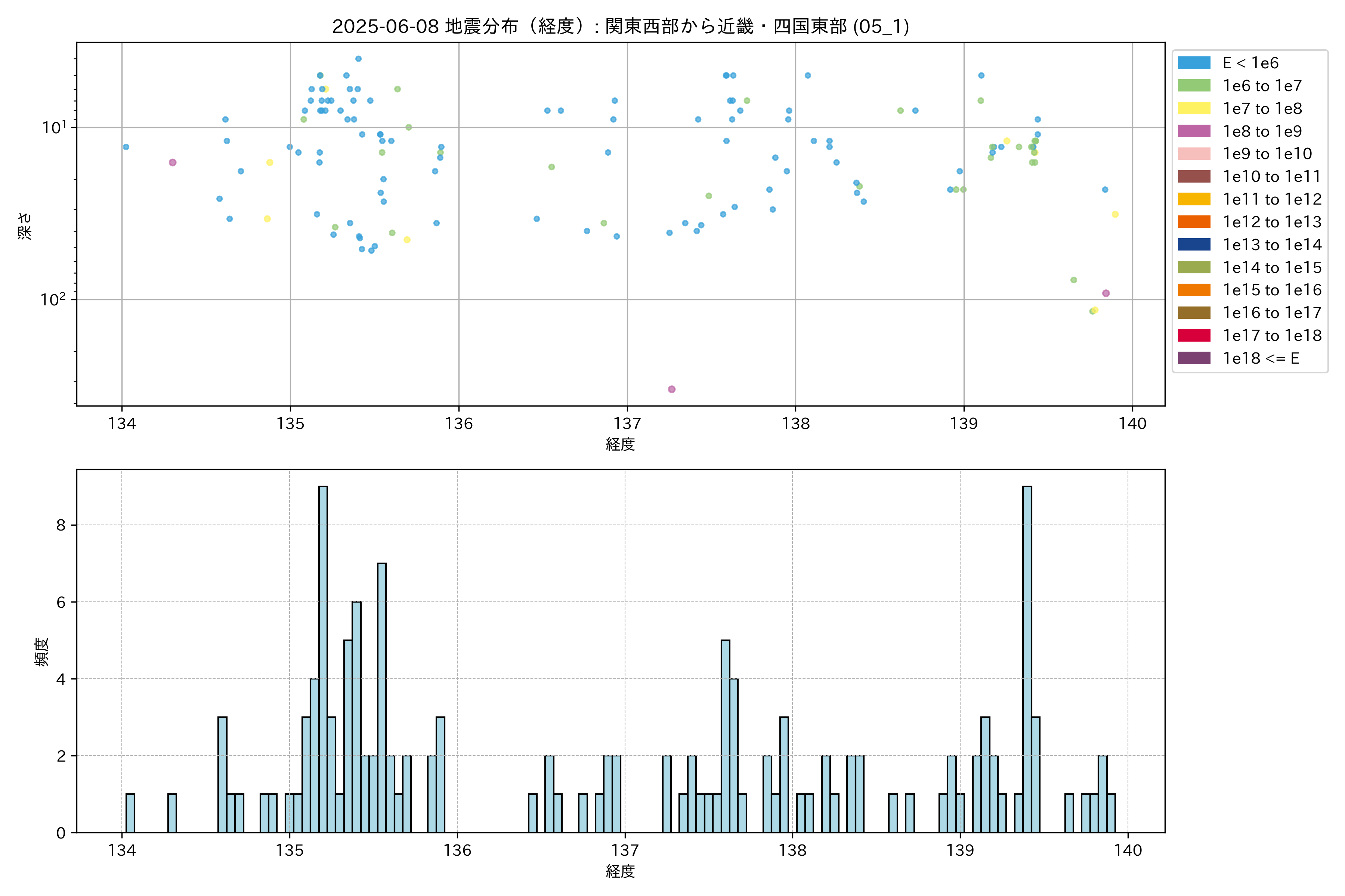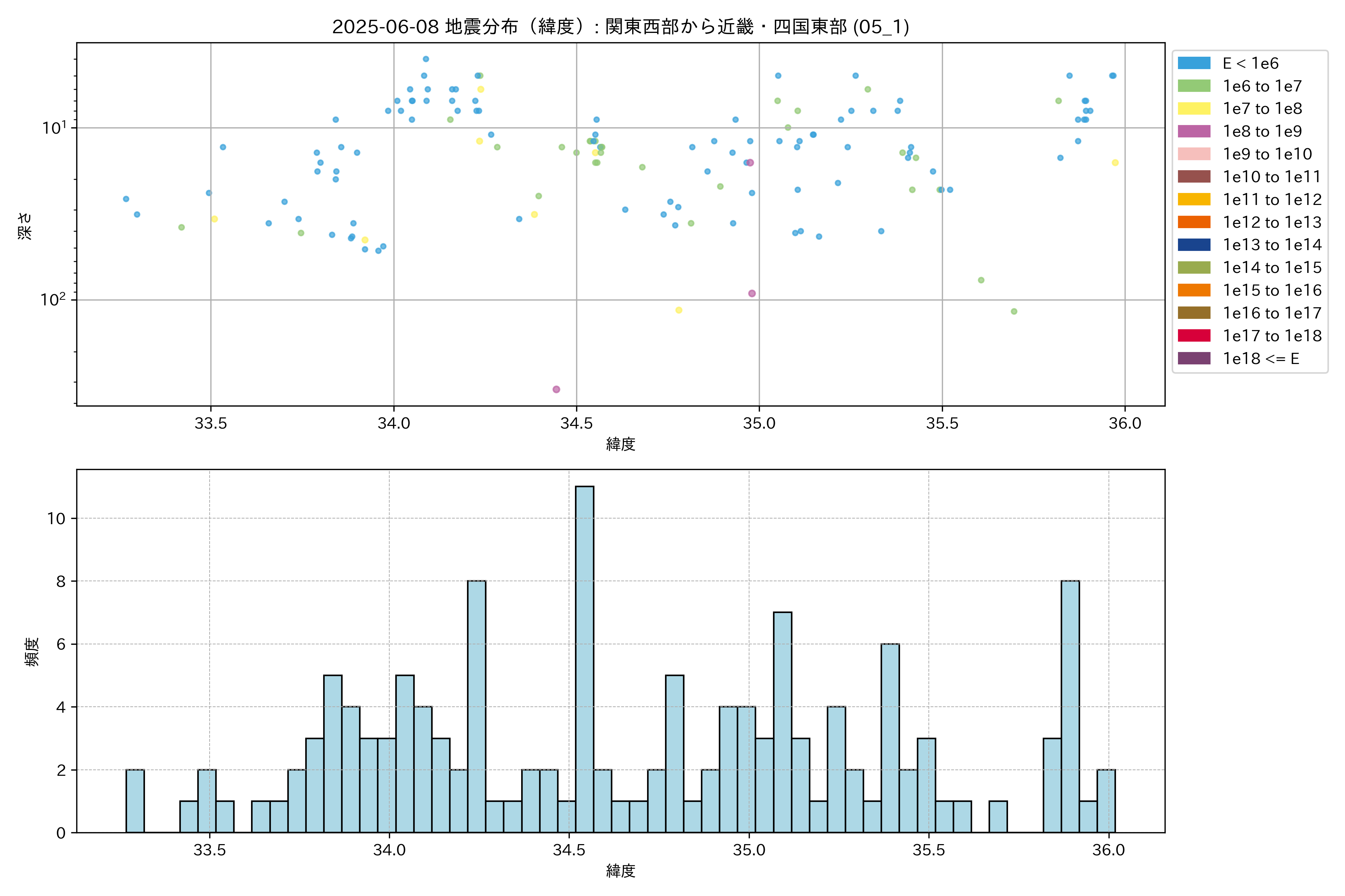 2025年06月08日 関東西部から近畿・四国東部 エリア震源マップ