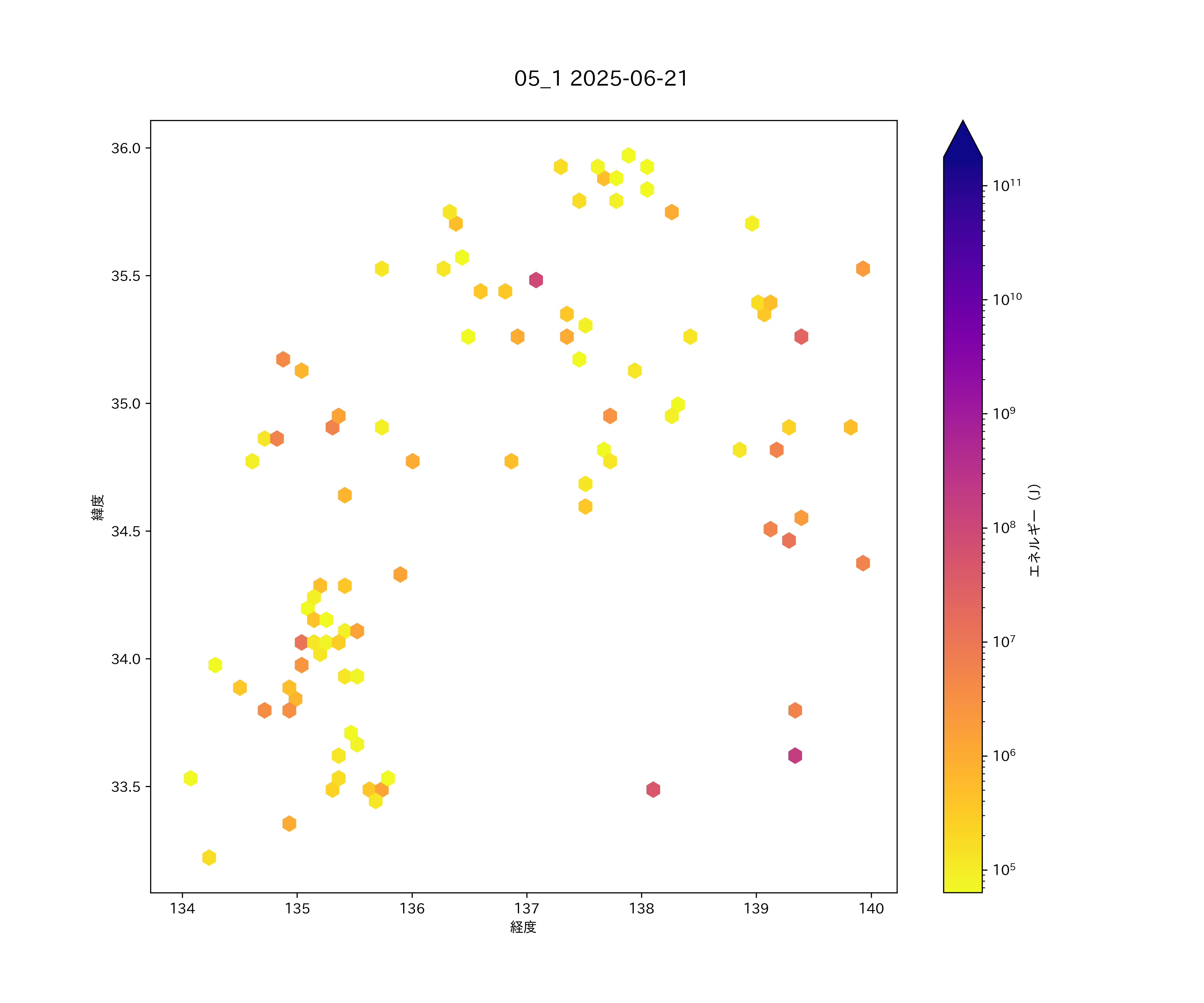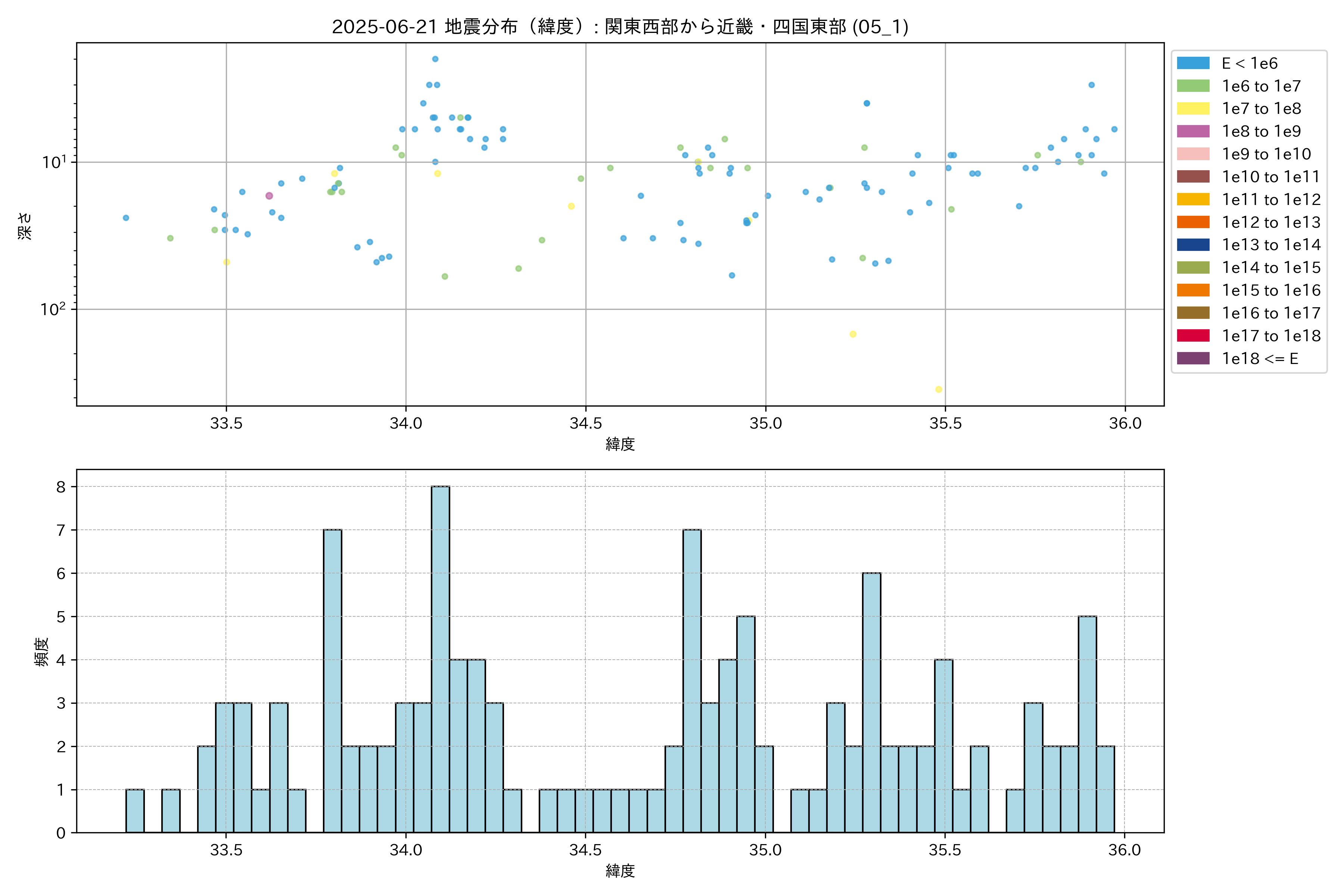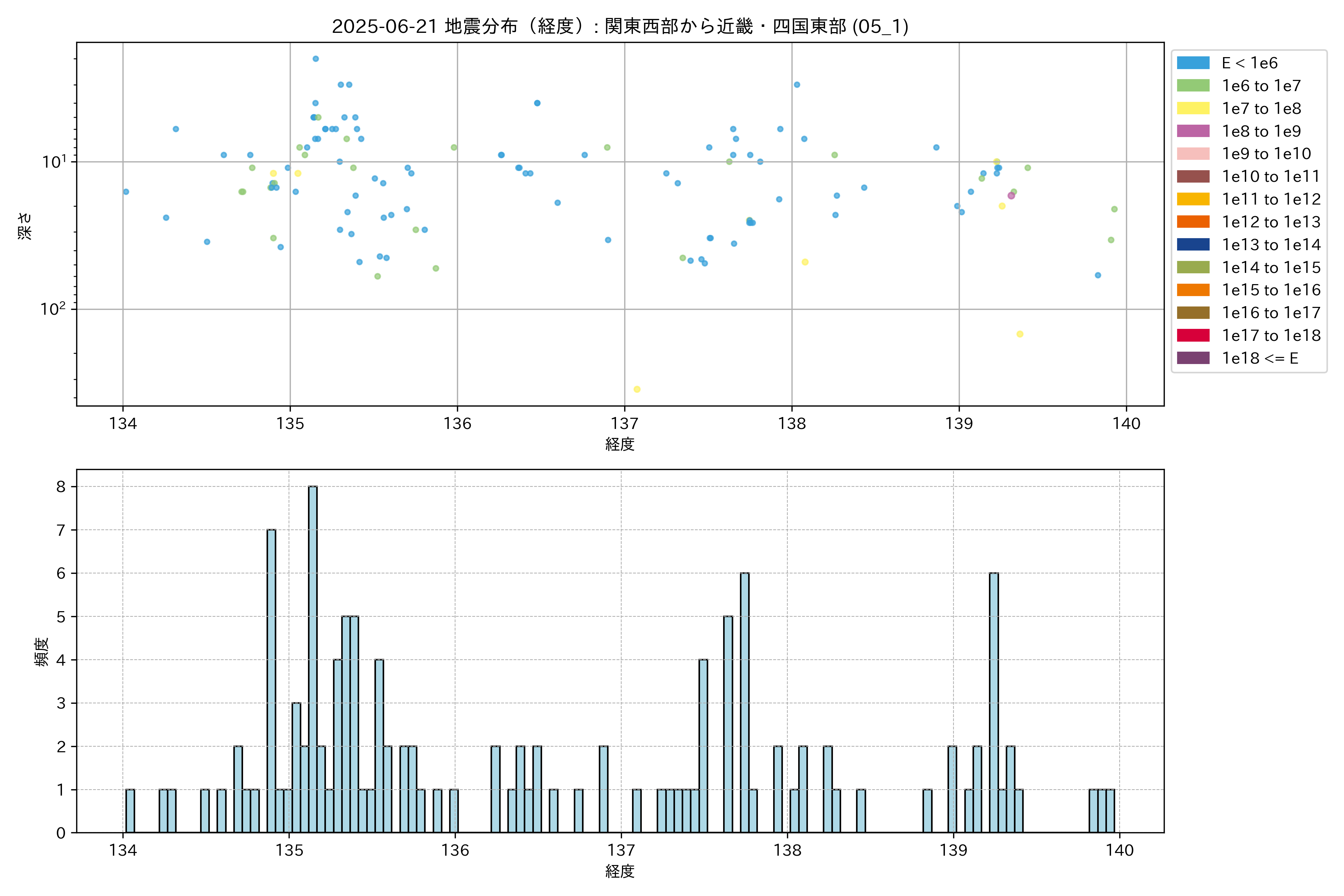2025年06月21日 関東西部から近畿・四国東部 エリア震源マップ