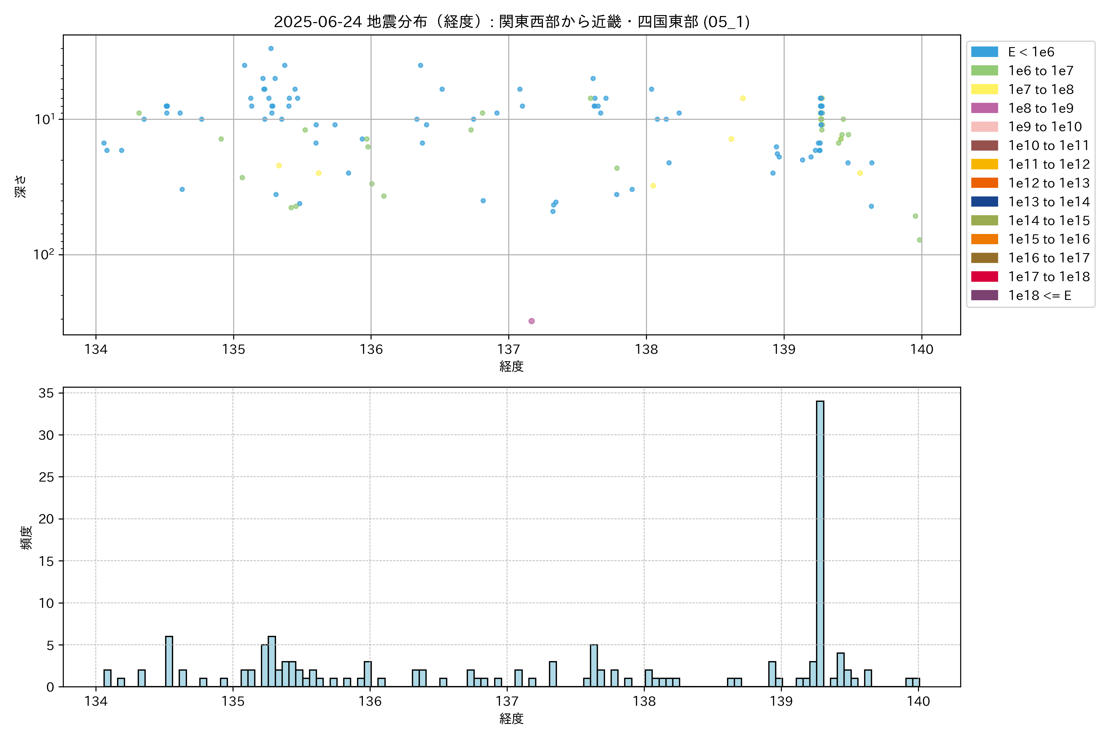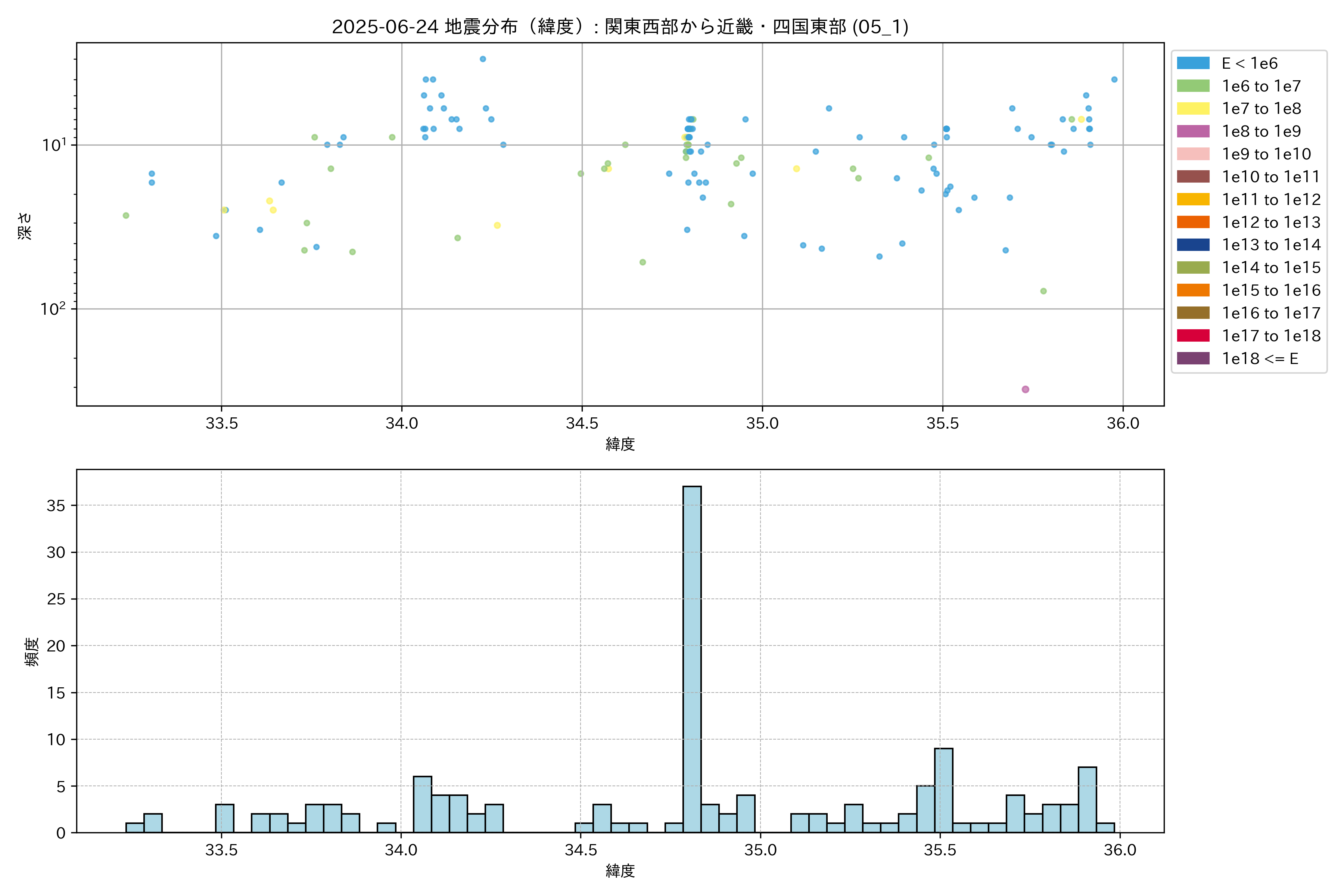 2025年06月24日 関東西部から近畿・四国東部 エリア震源マップ