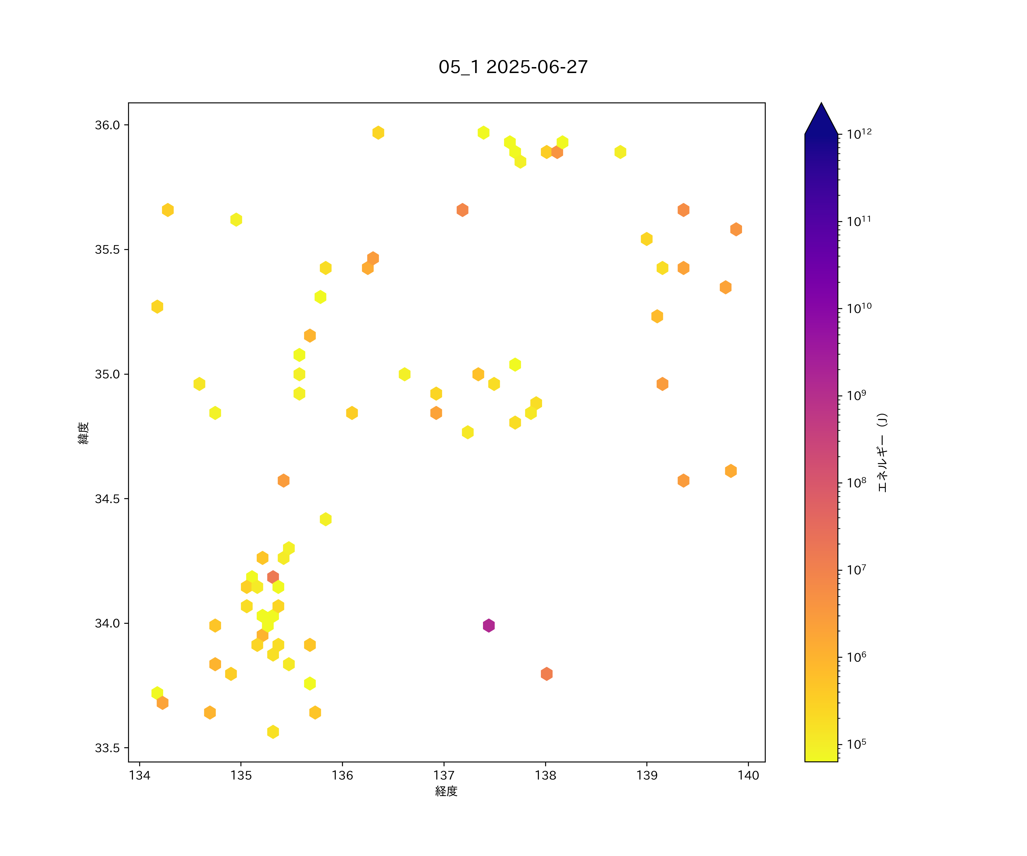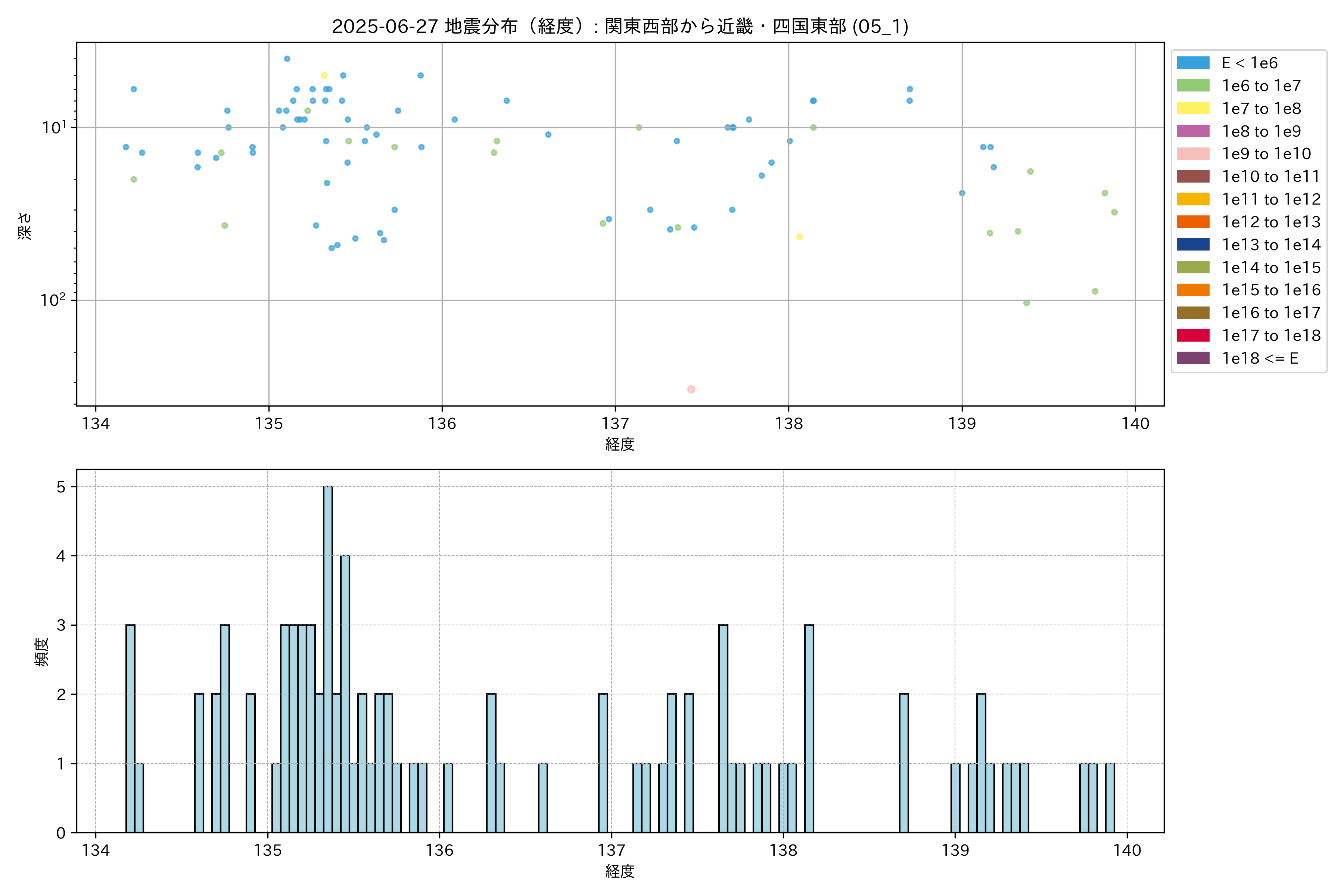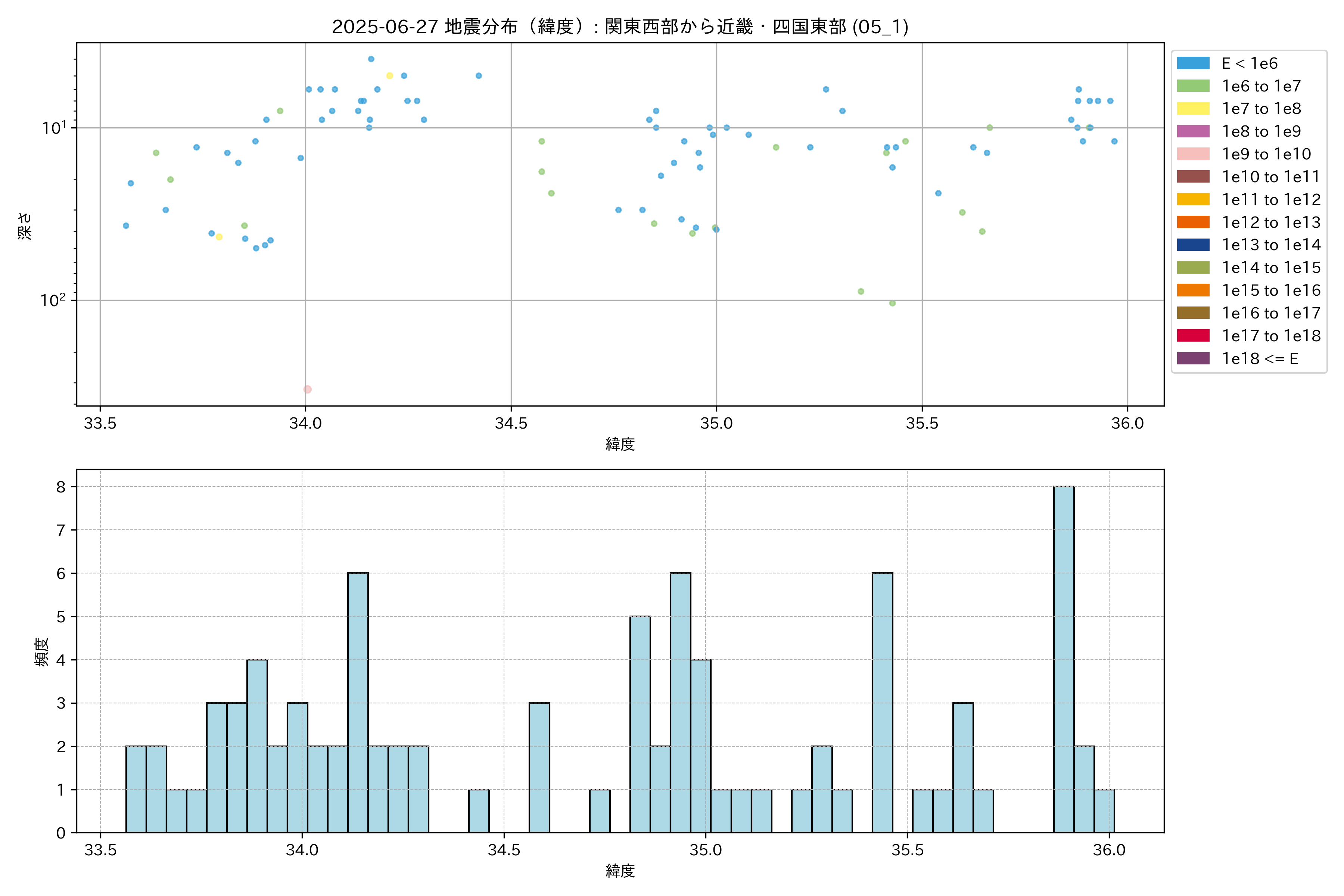 2025年06月27日 関東西部から近畿・四国東部 エリア震源マップ