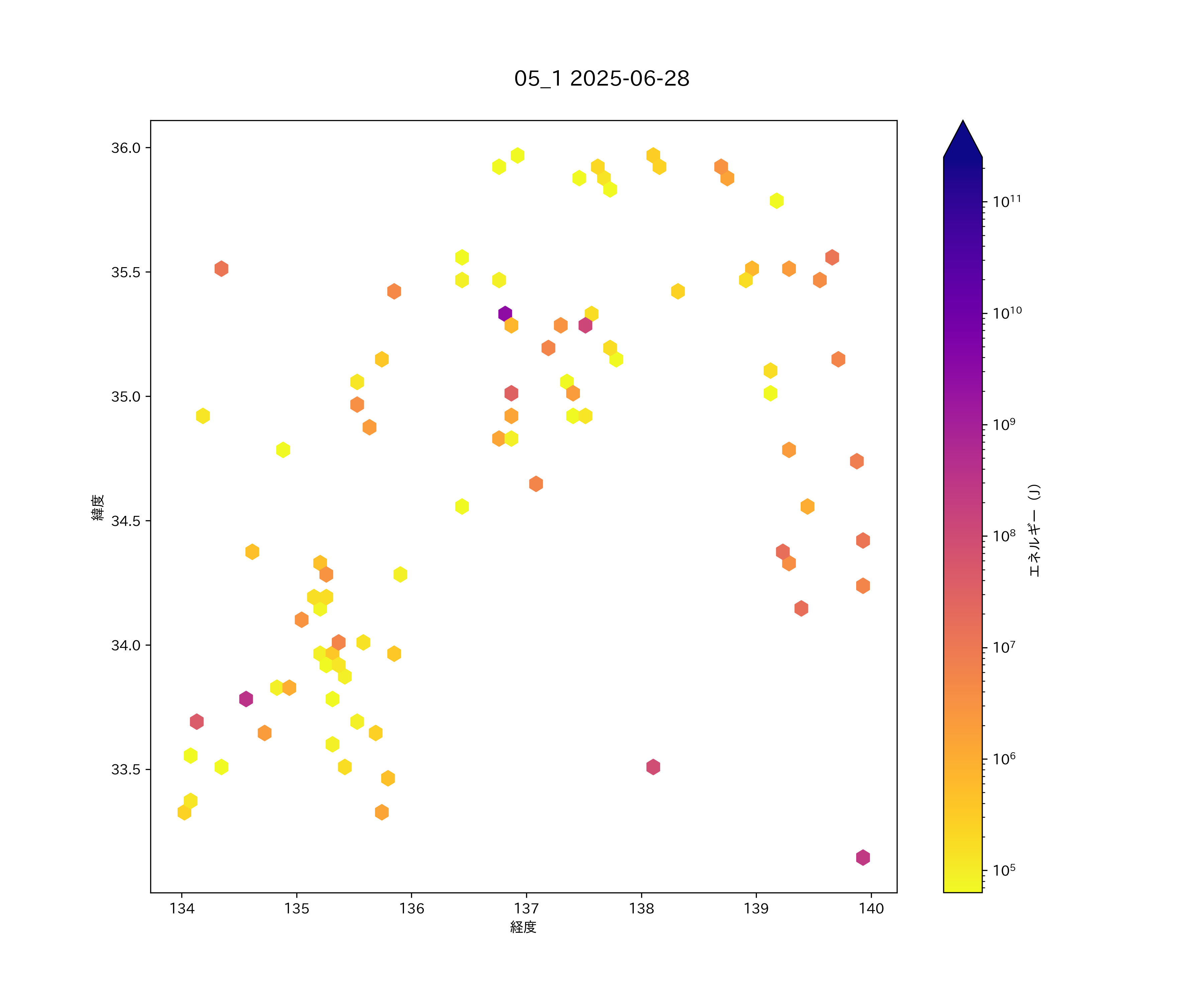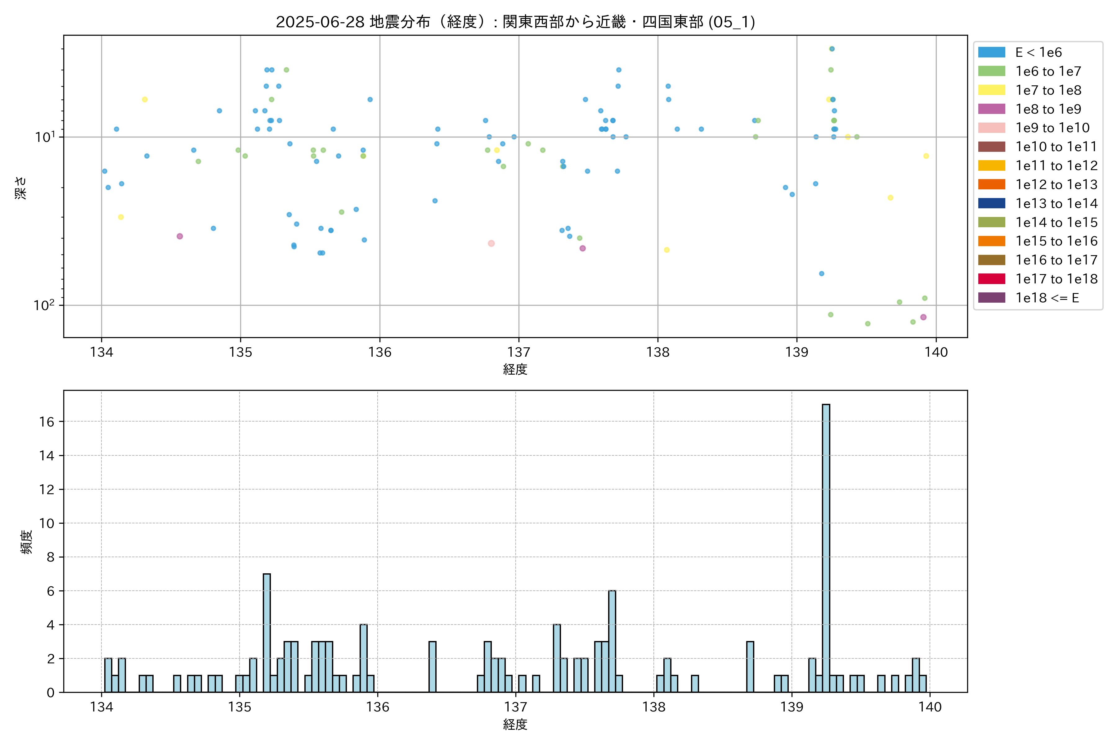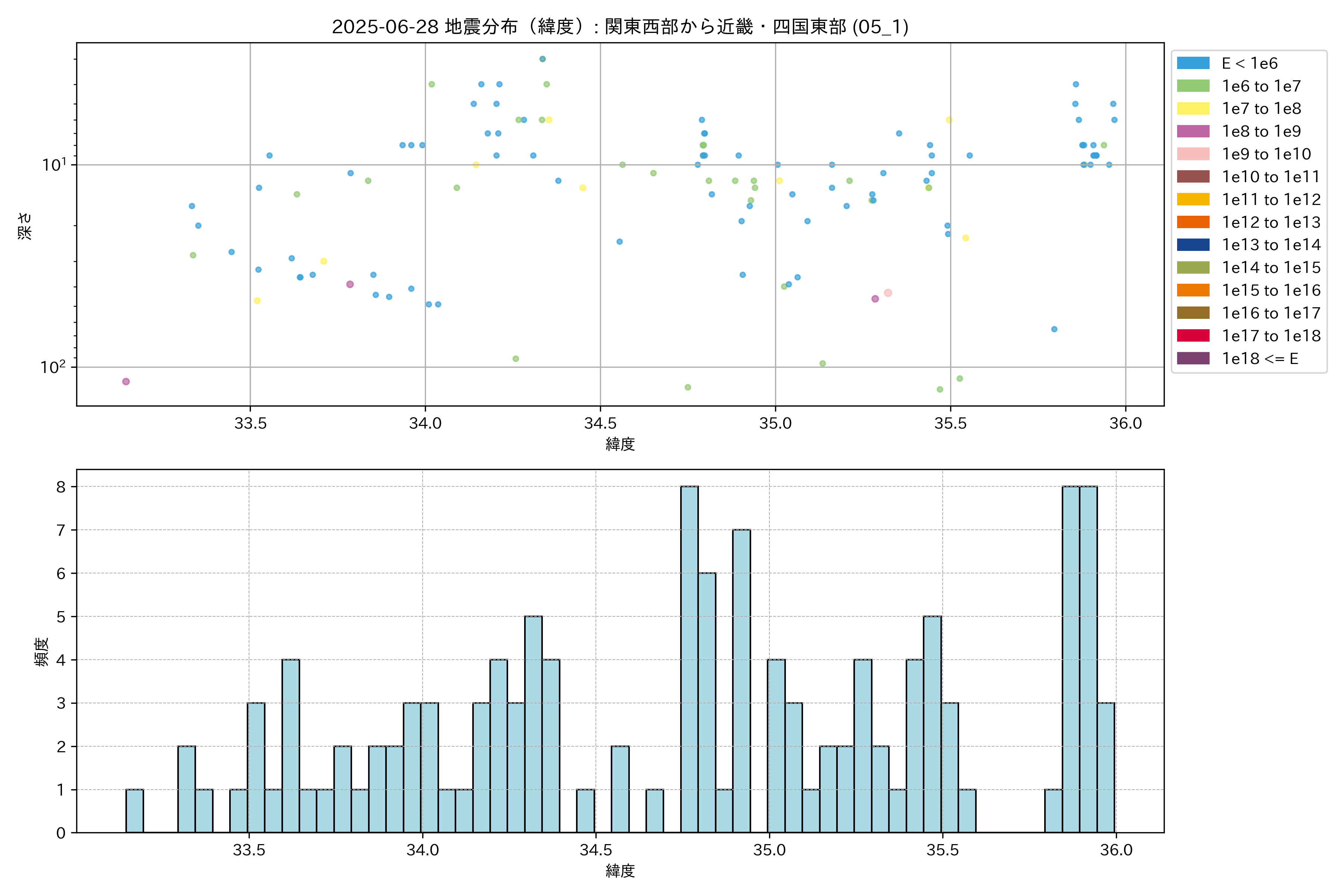 2025年06月28日 関東西部から近畿・四国東部 エリア震源マップ