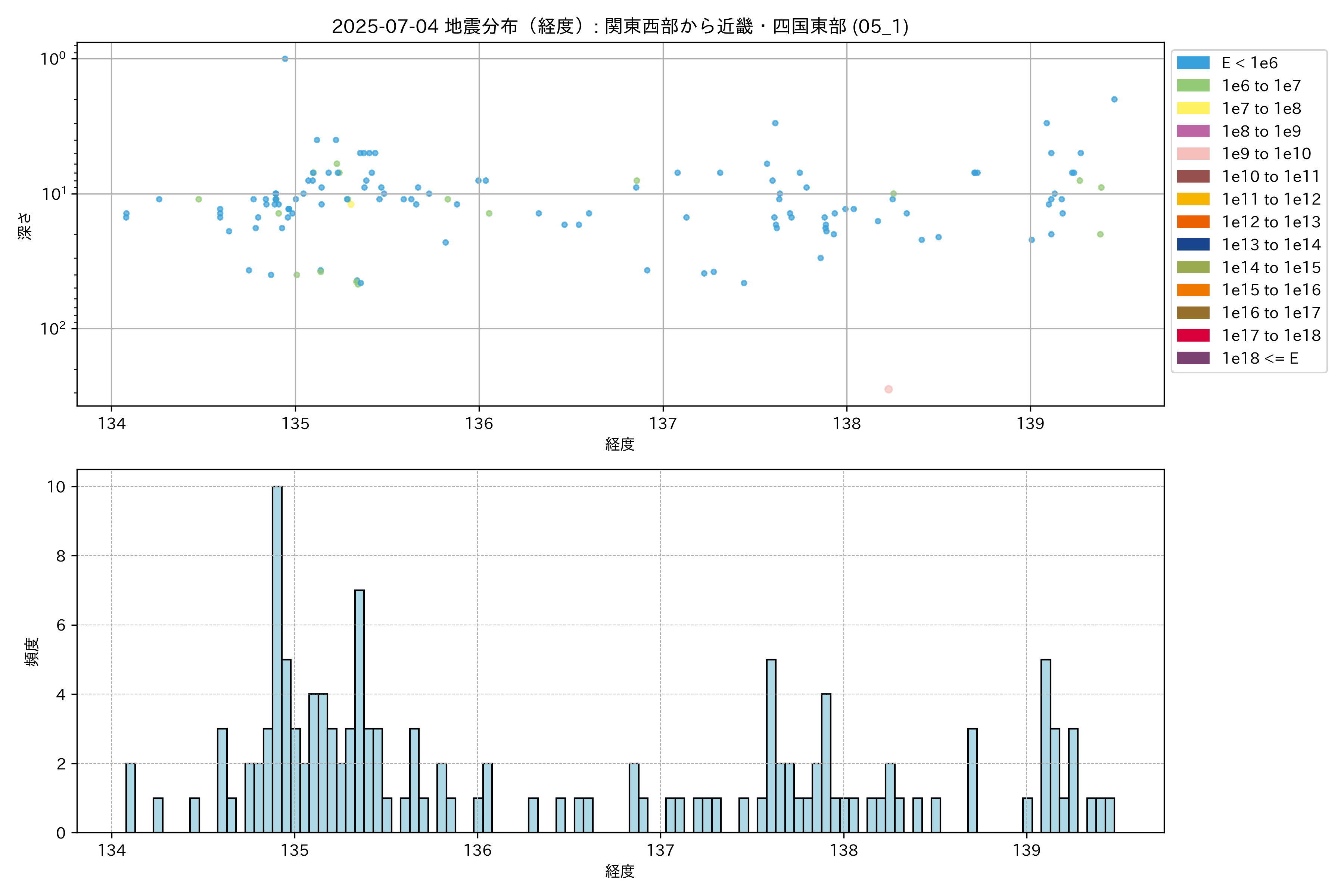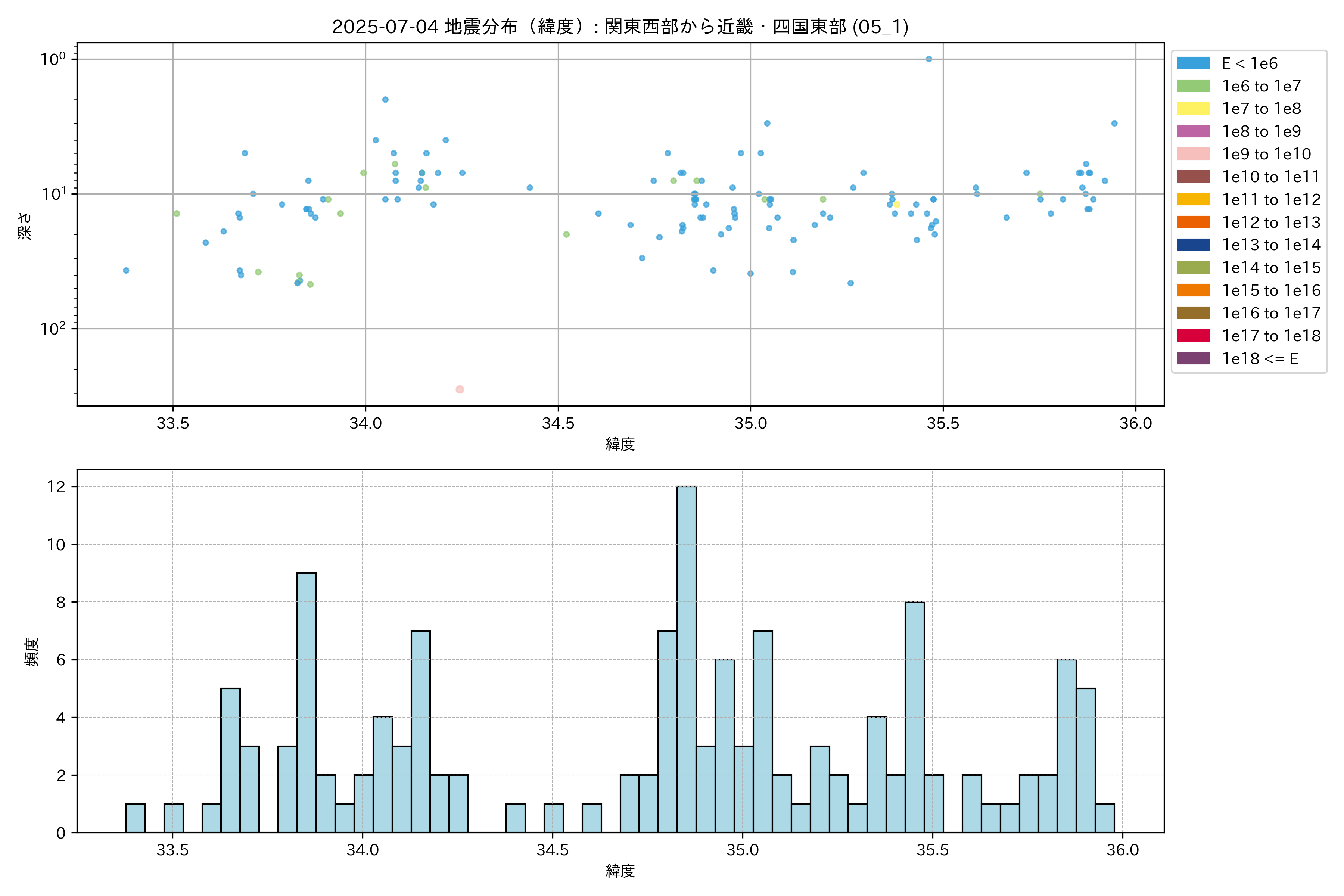 2025年07月04日 関東西部から近畿・四国東部 エリア震源マップ
