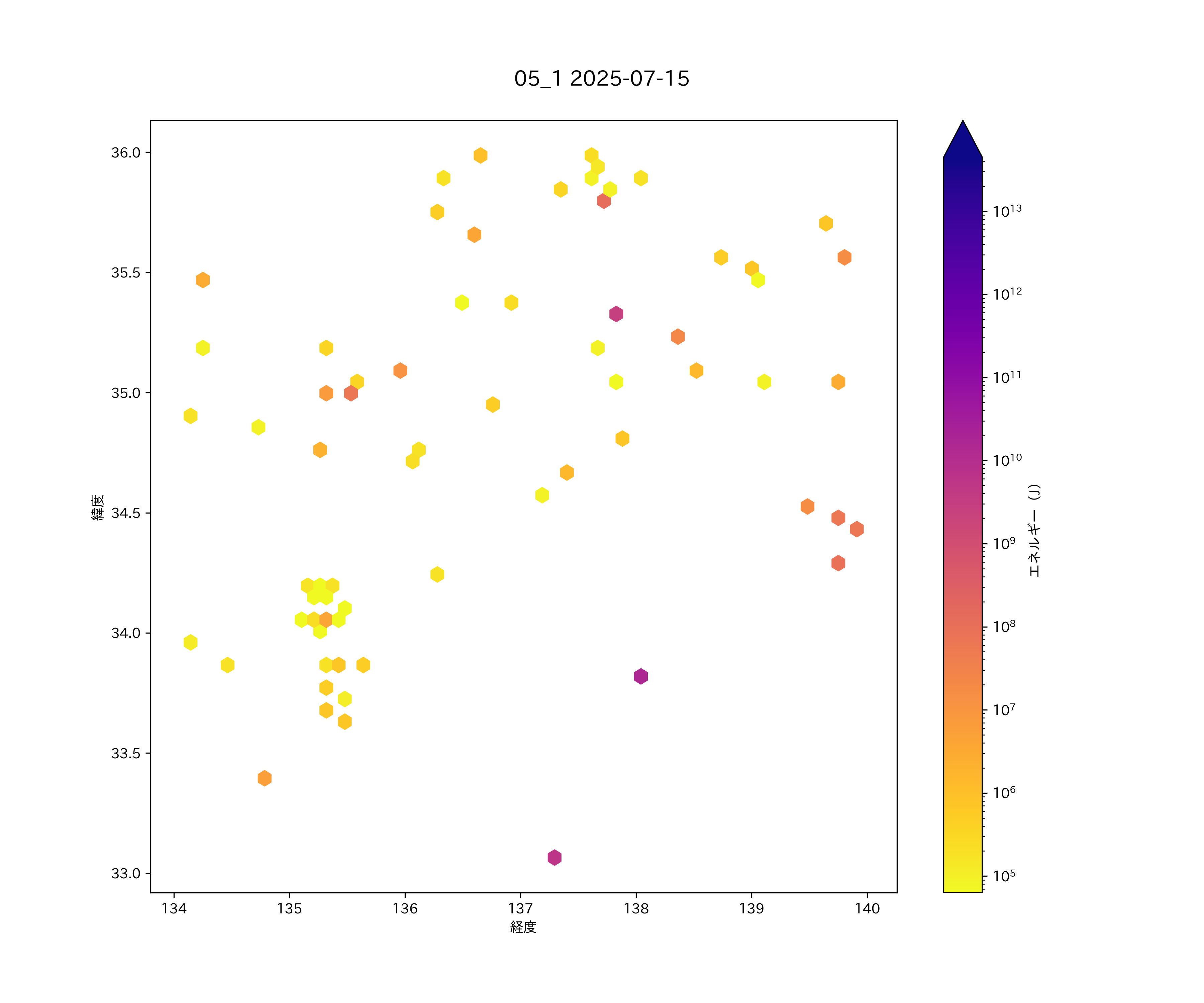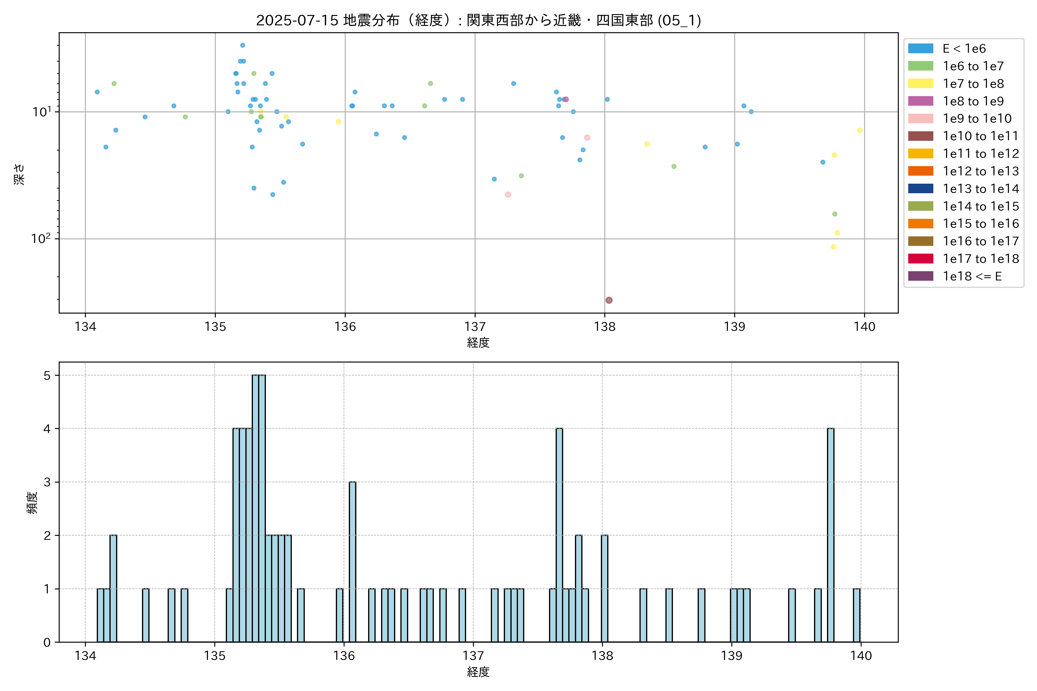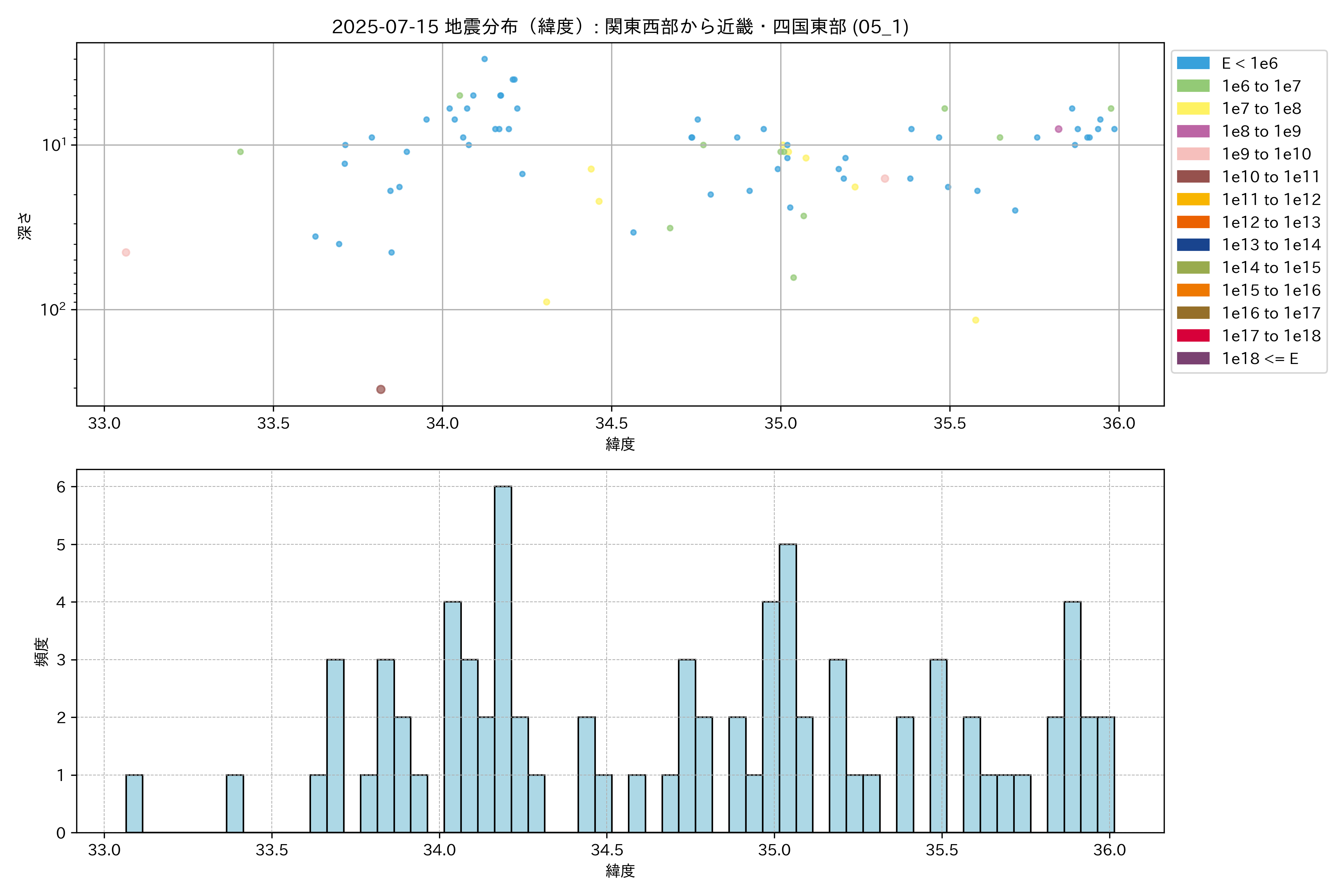 2025年07月15日 関東西部から近畿・四国東部 エリア震源マップ