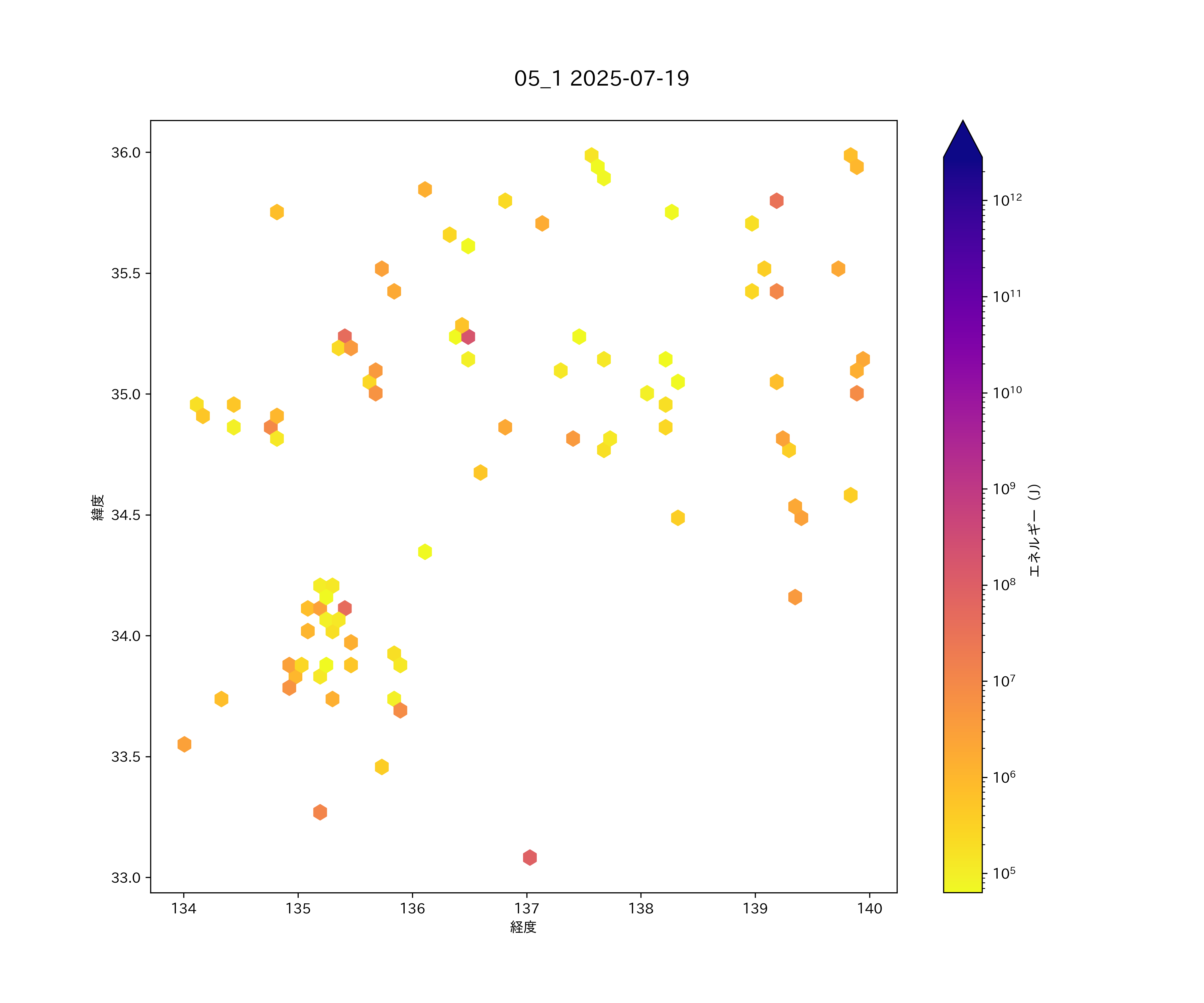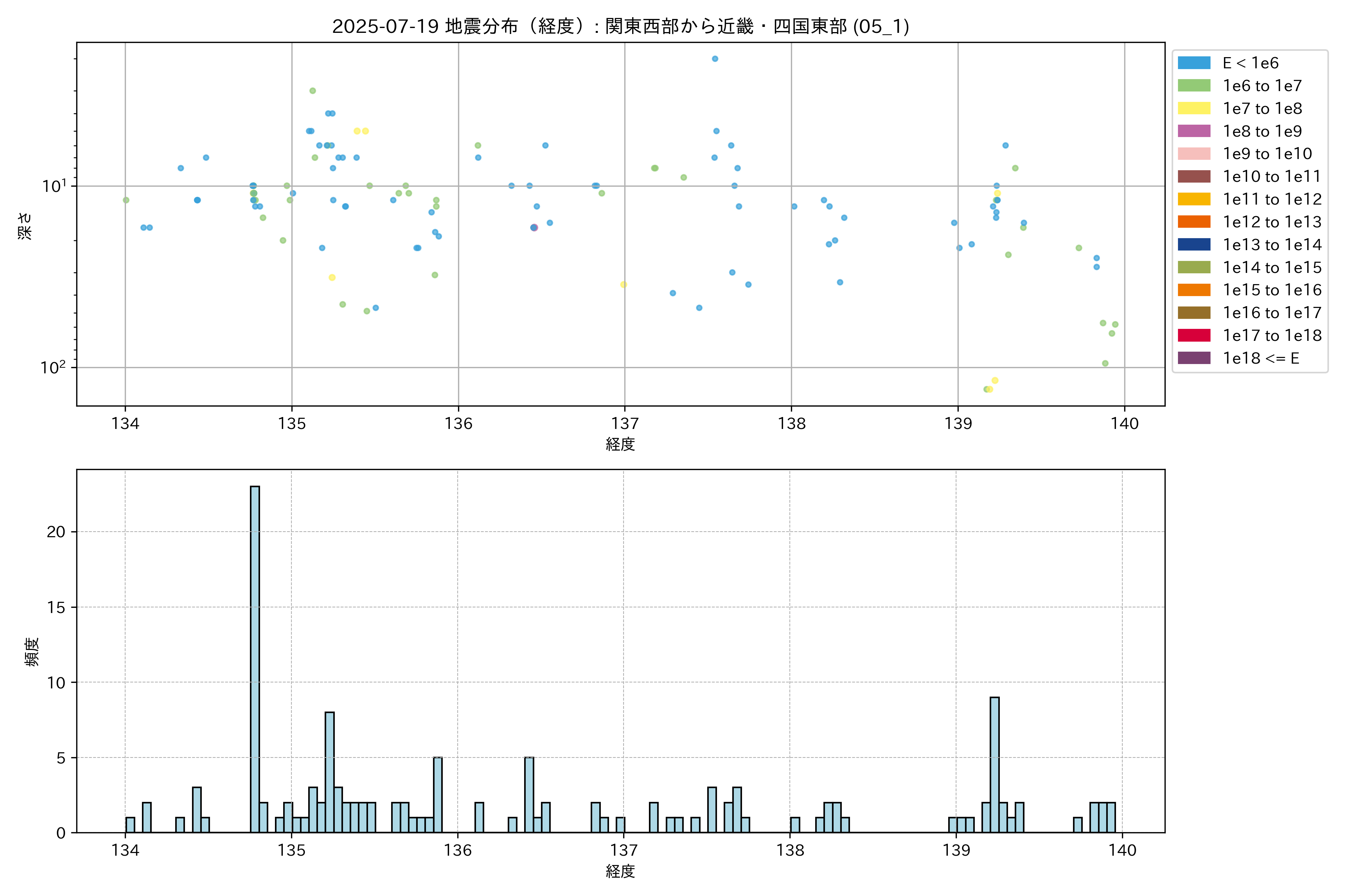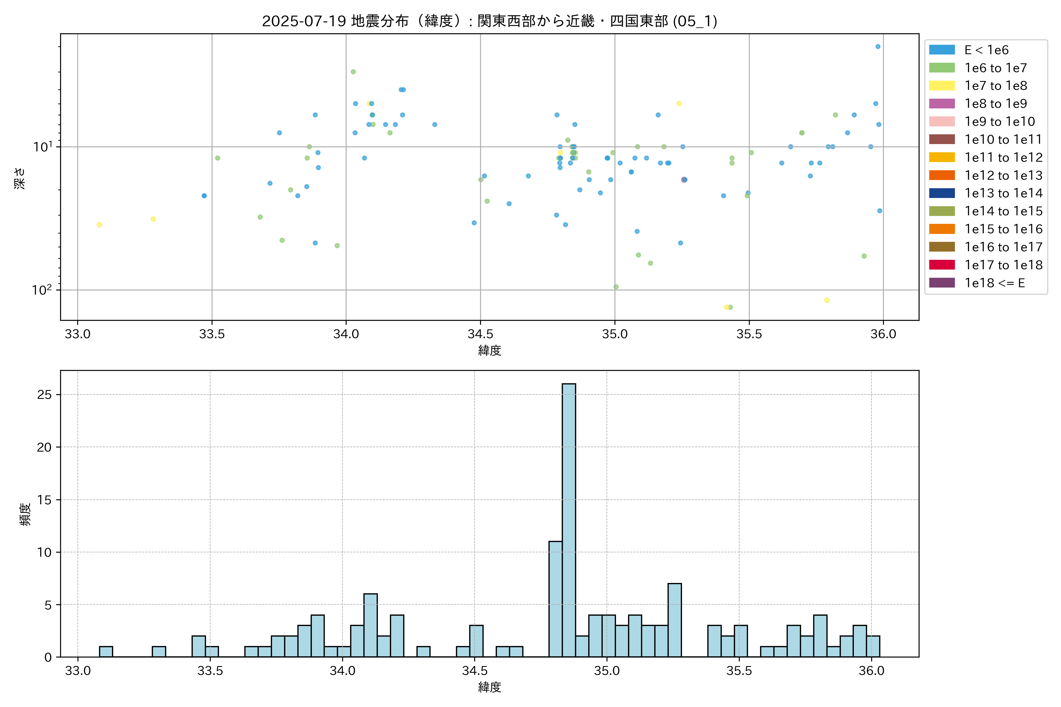 2025年07月19日 関東西部から近畿・四国東部 エリア震源マップ