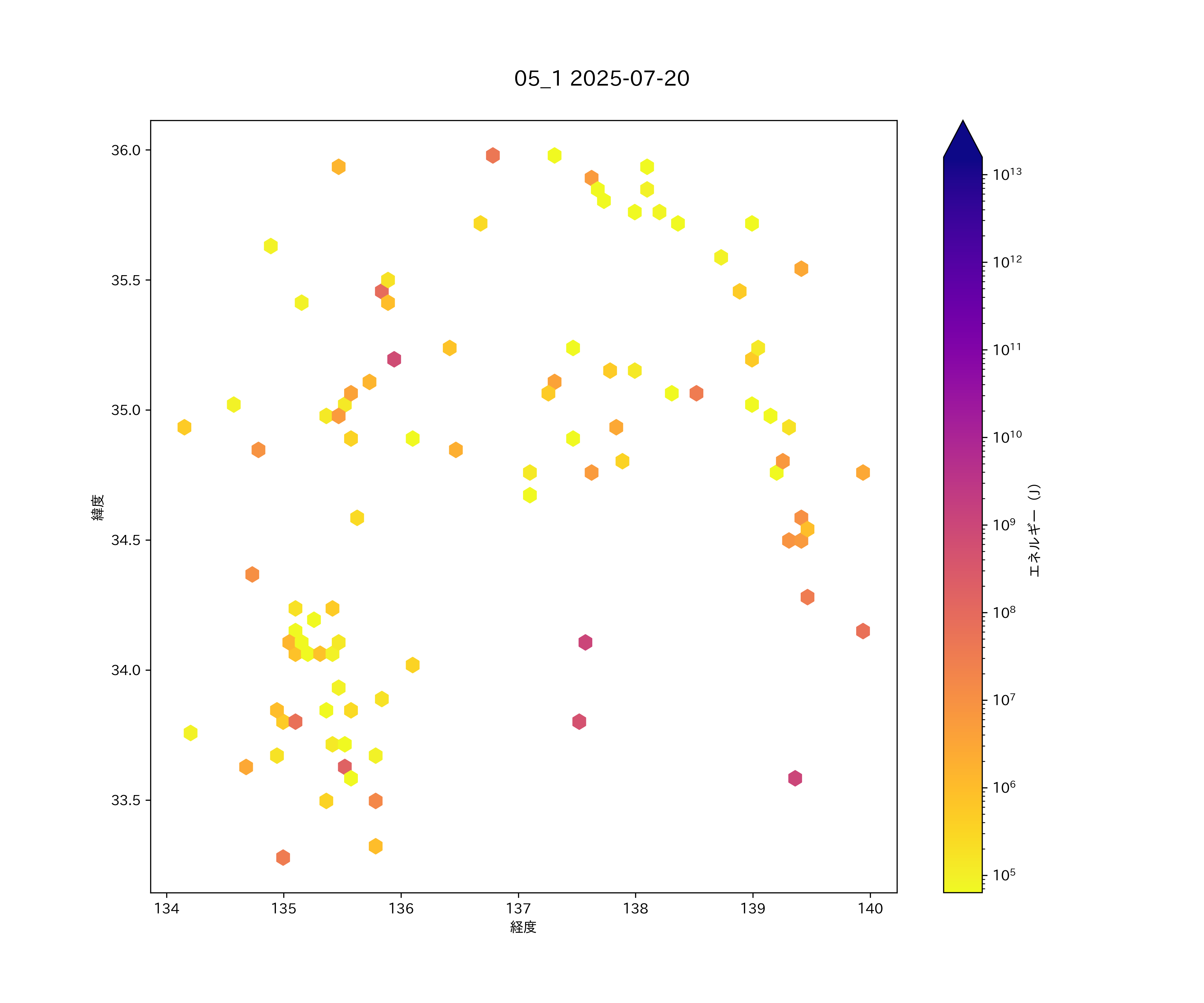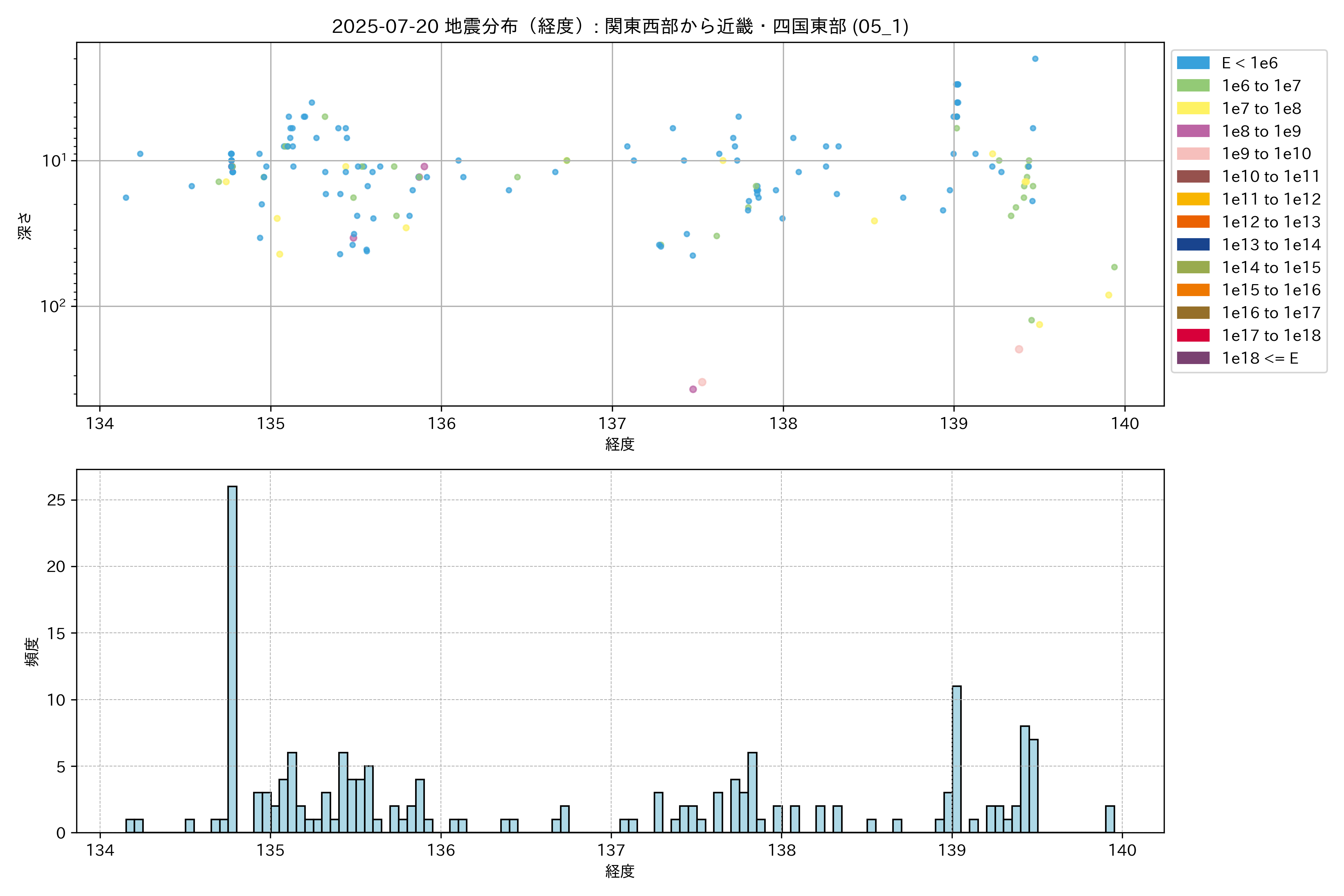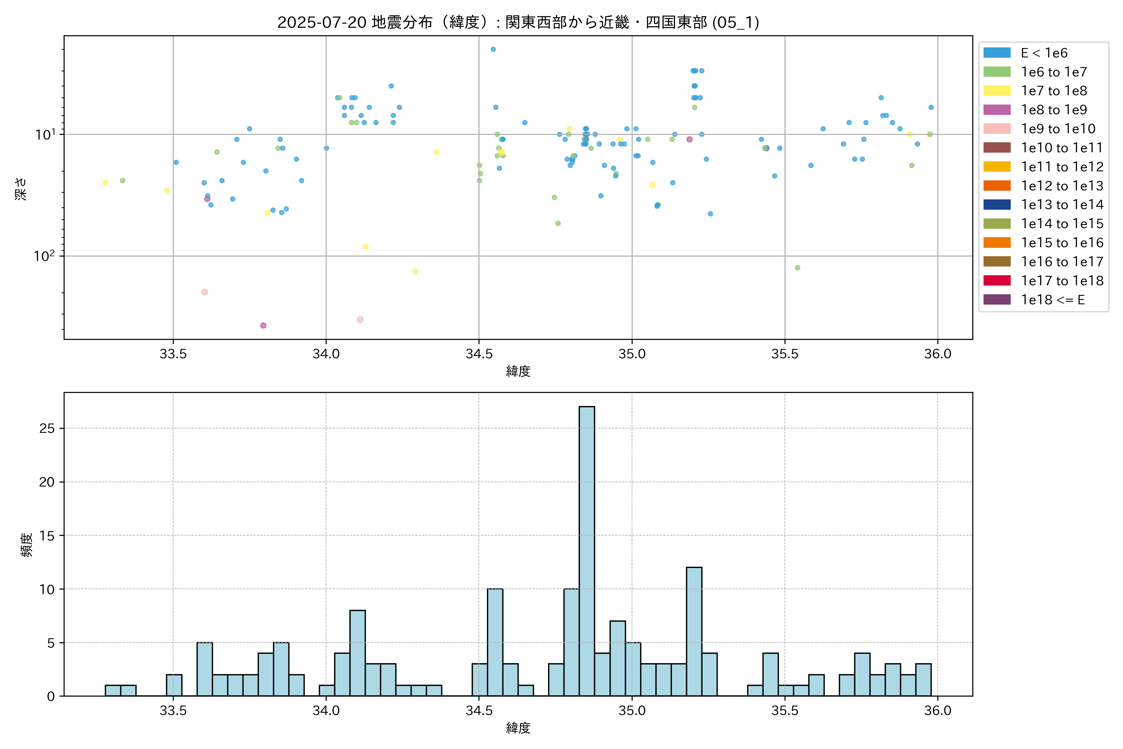 2025年07月20日 関東西部から近畿・四国東部 エリア震源マップ