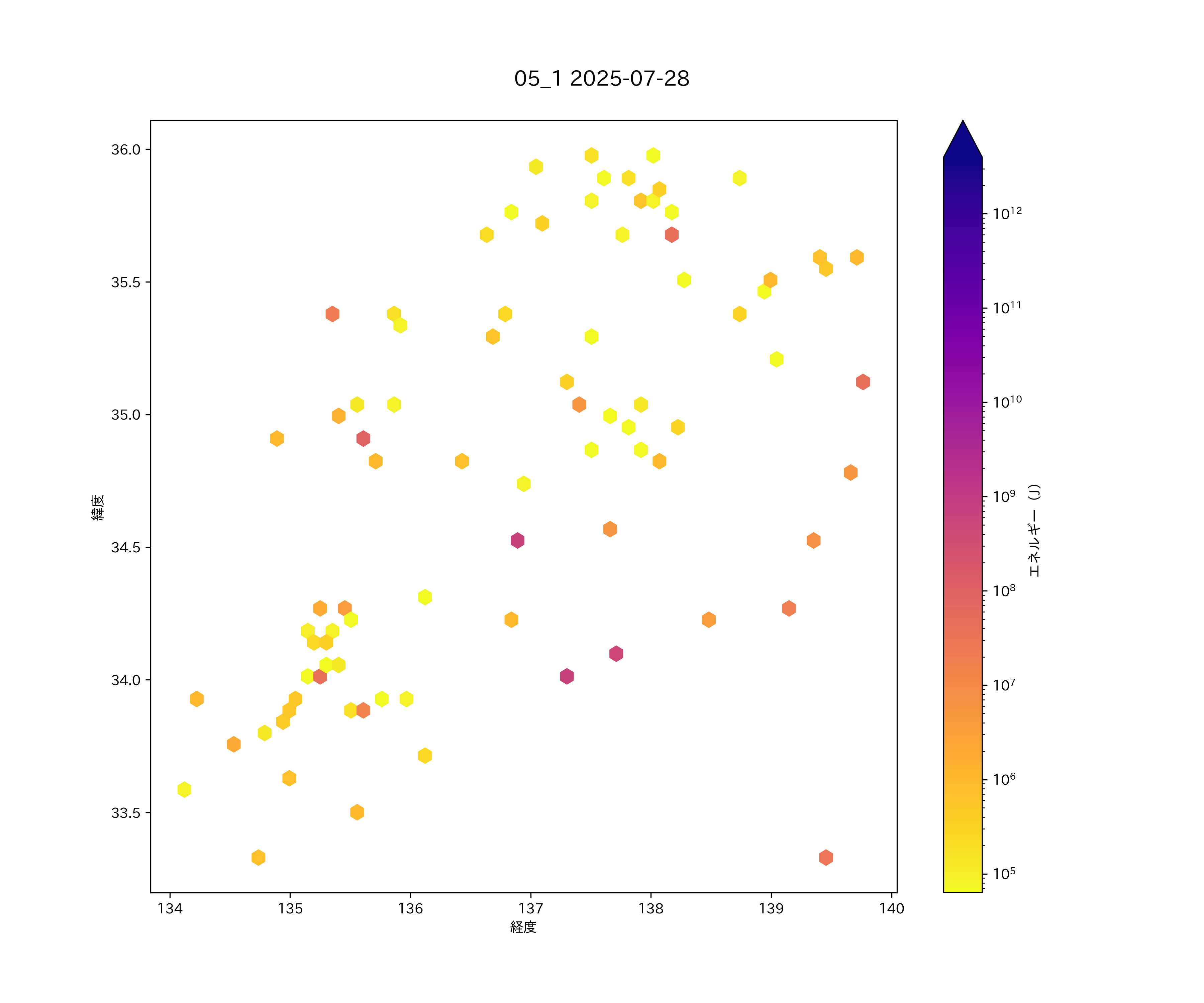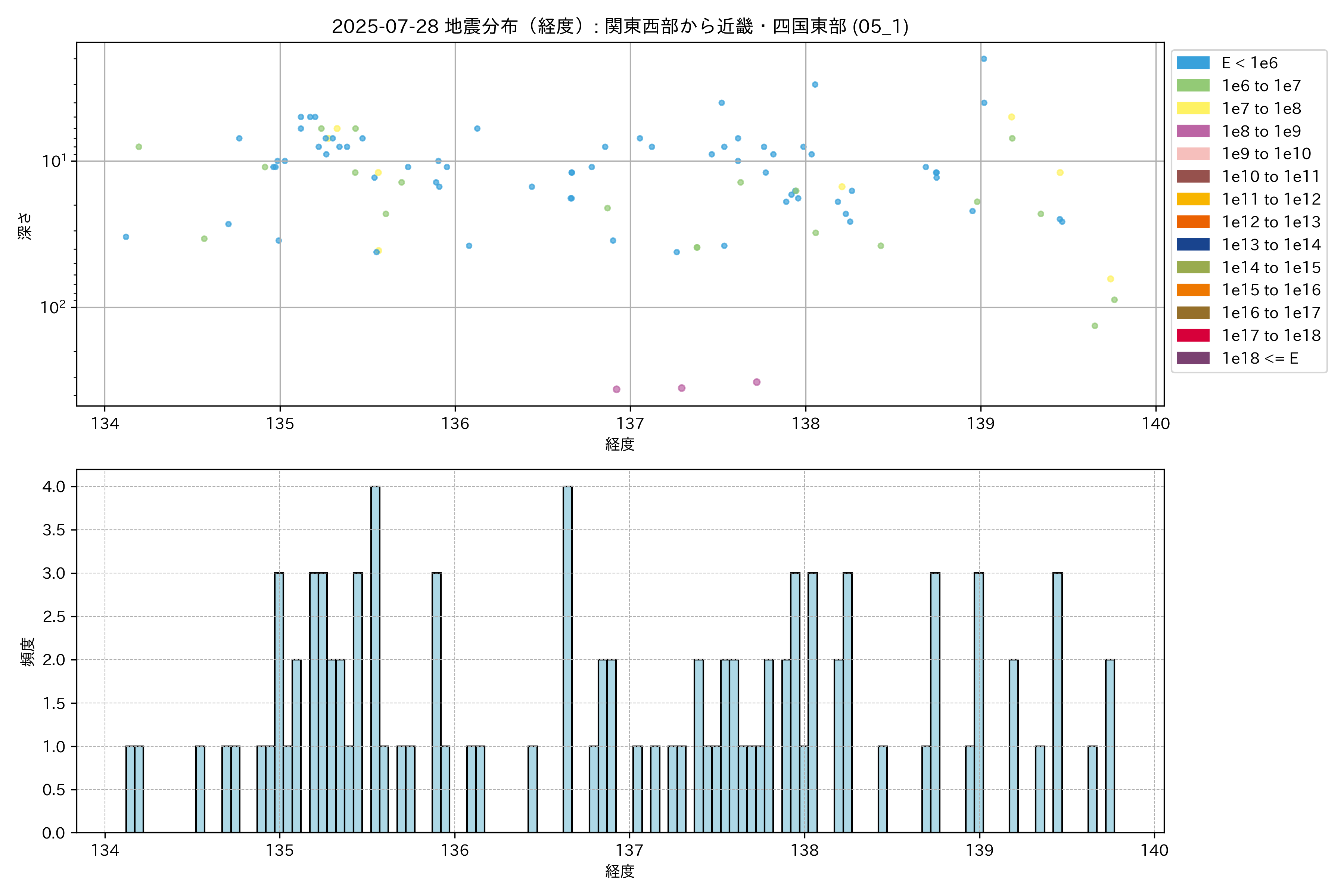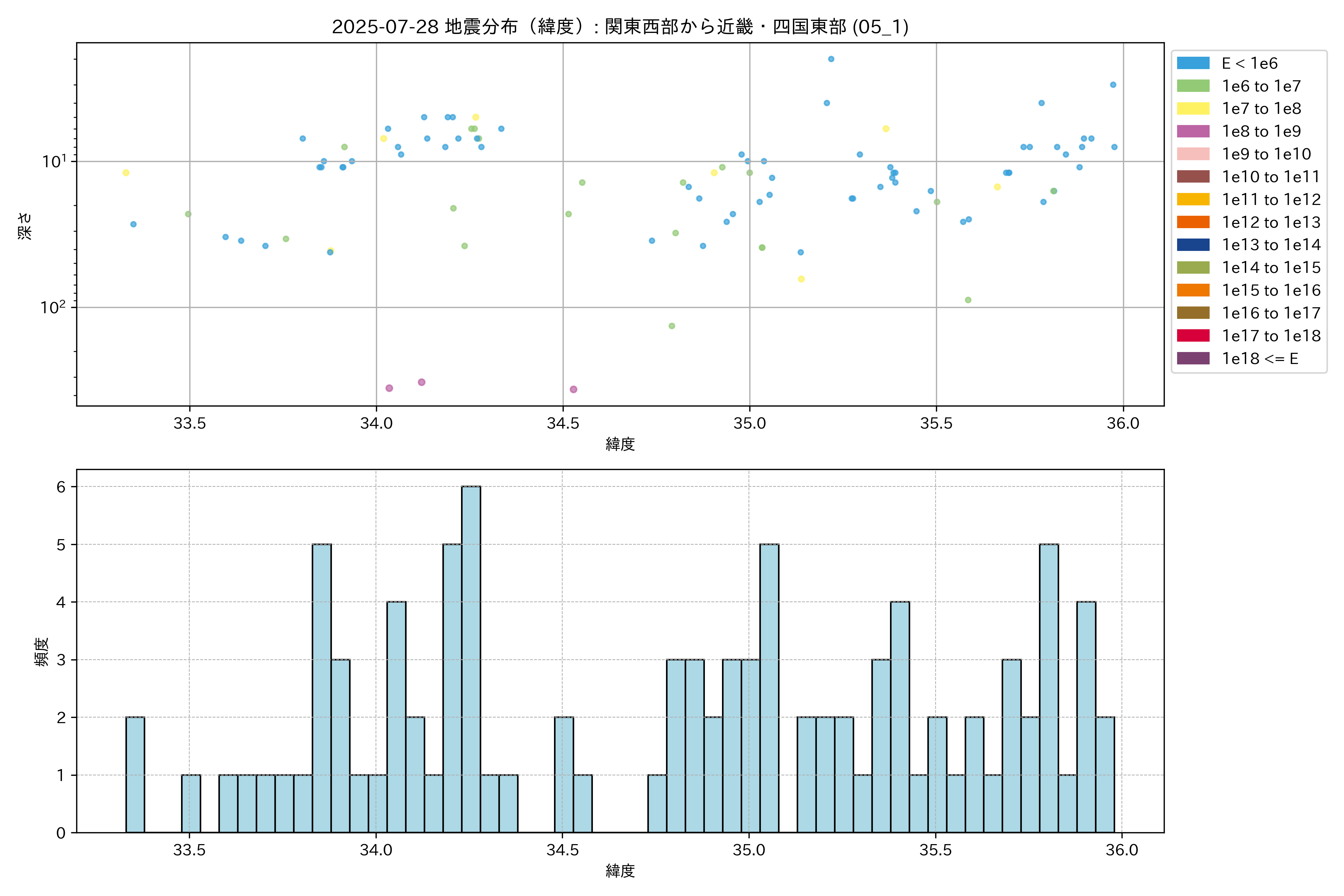 2025年07月28日 関東西部から近畿・四国東部 エリア震源マップ