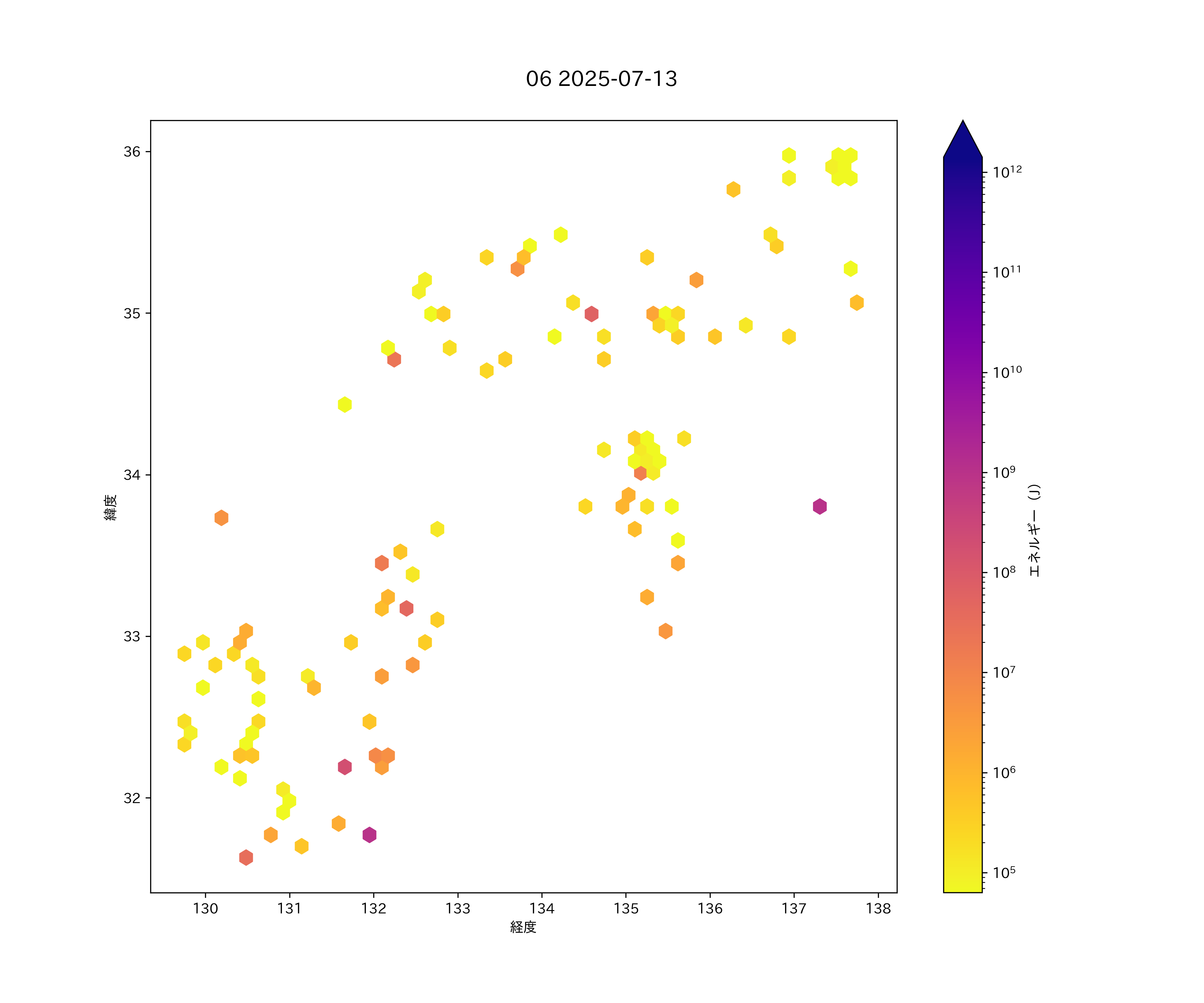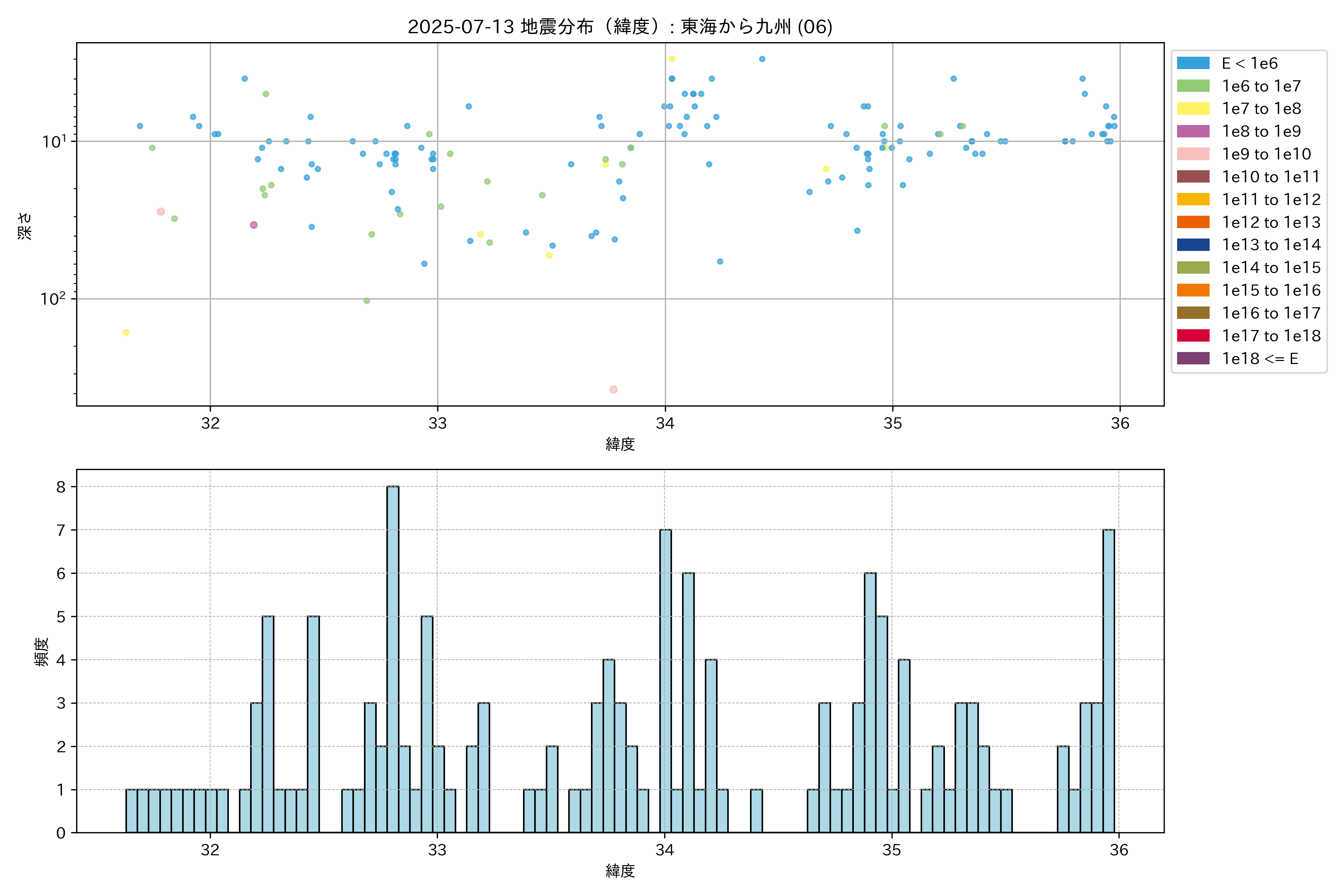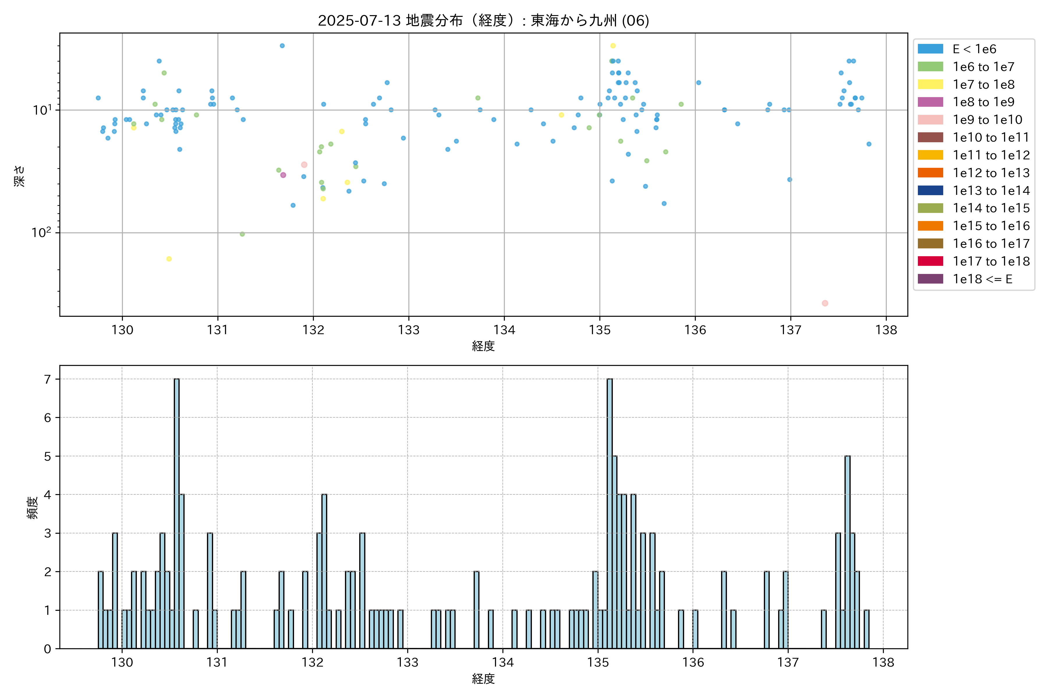 2025年07月13日 東海から九州 エリア震源マップ