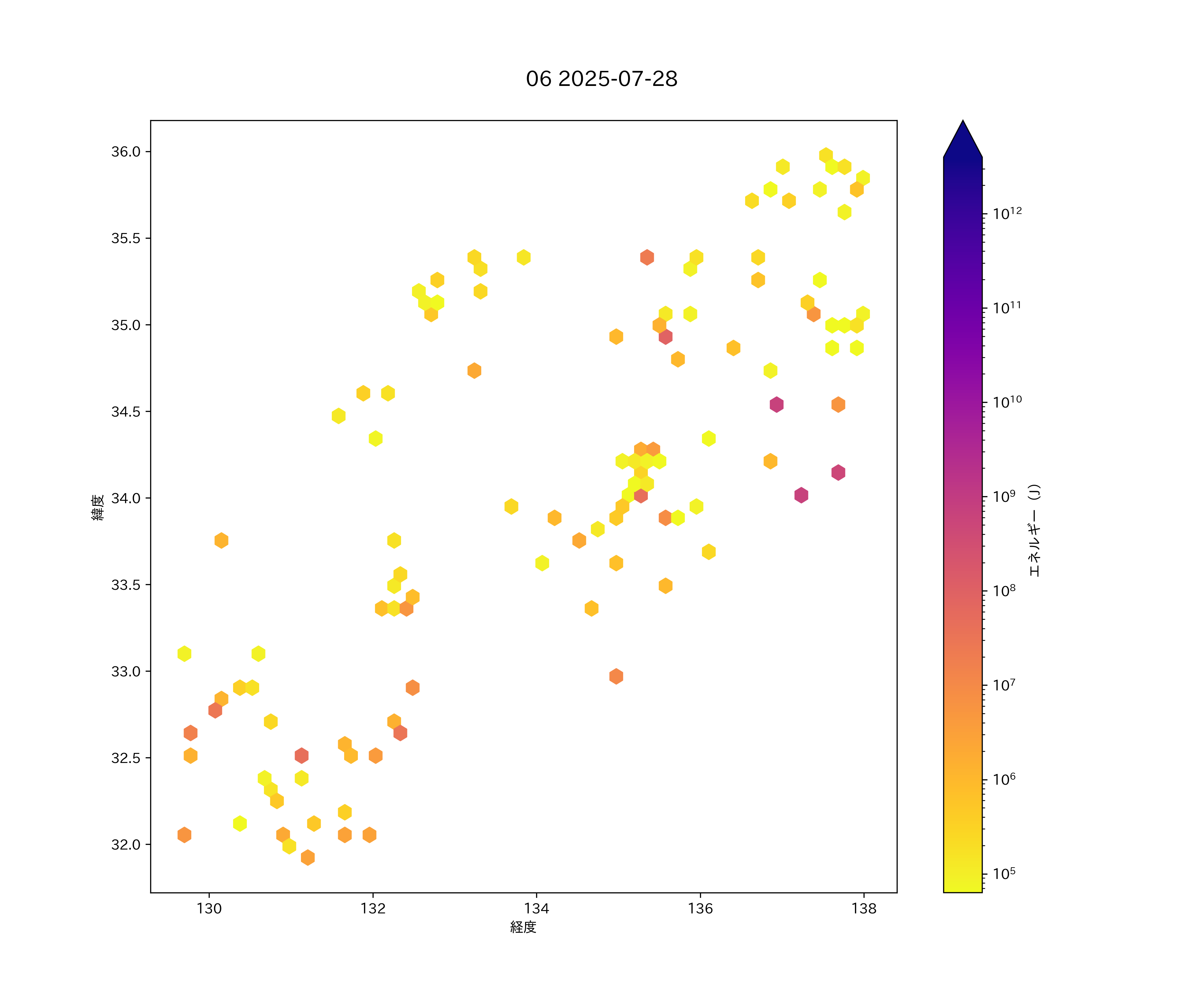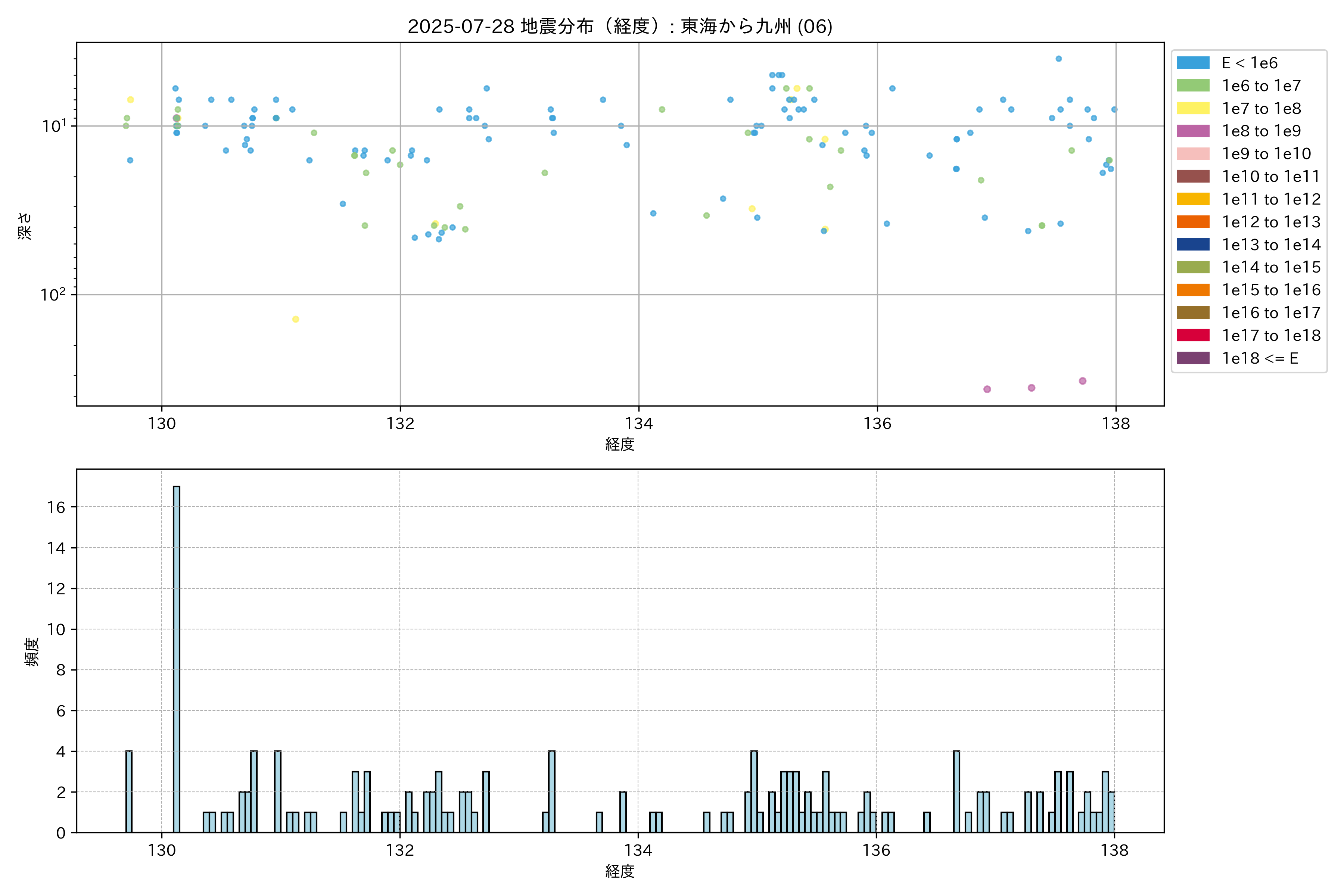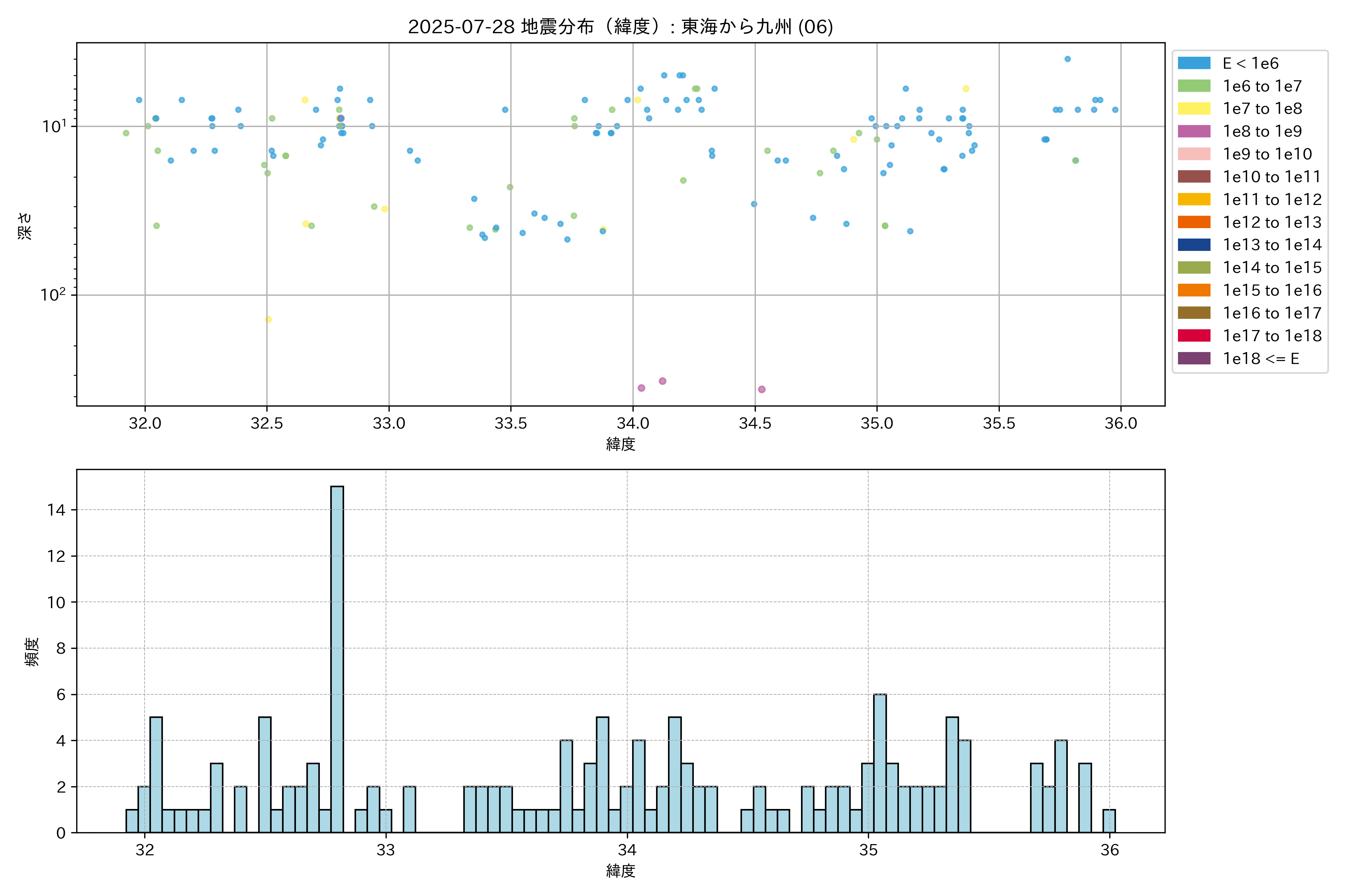 2025年07月28日 東海から九州 エリア震源マップ