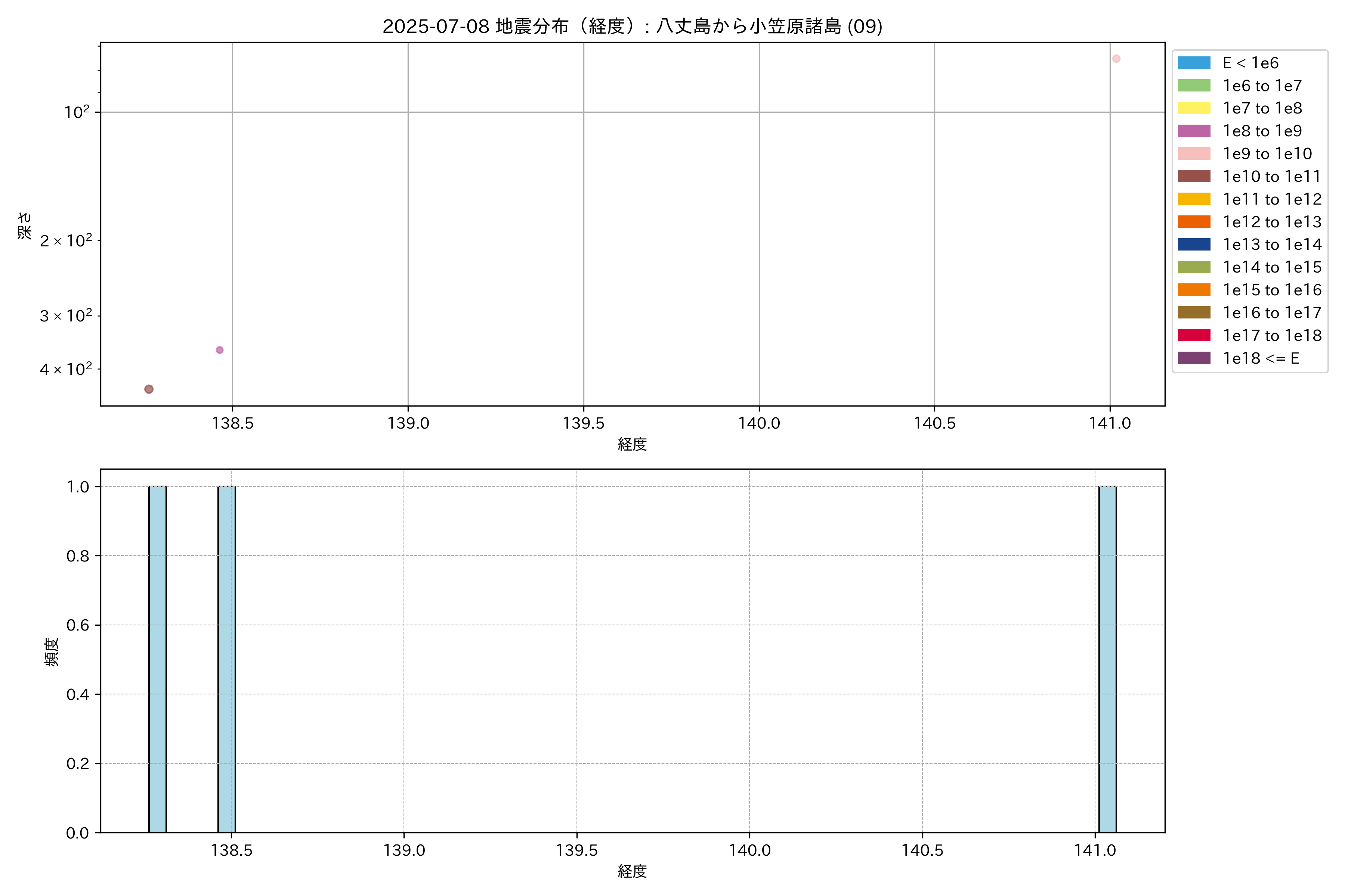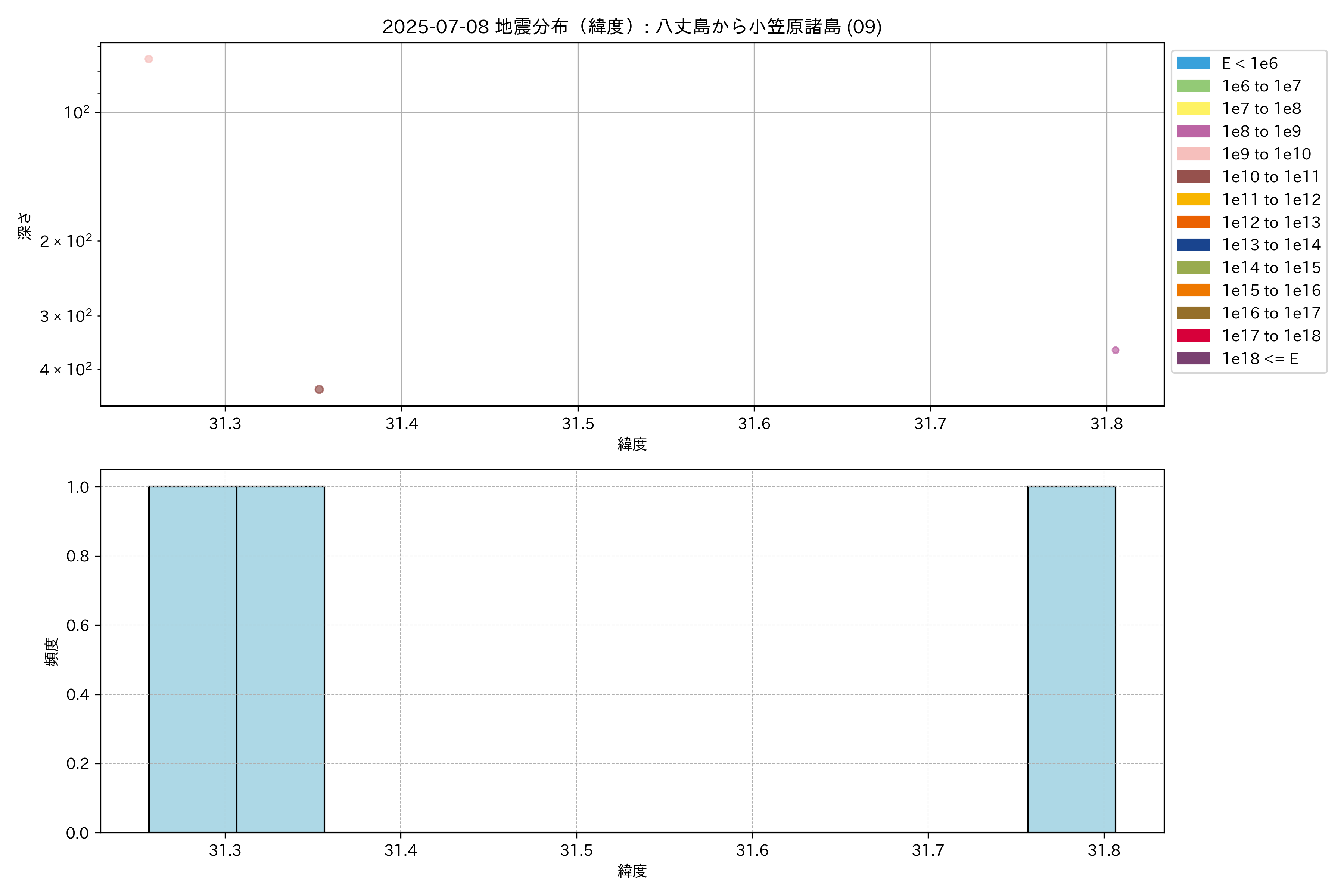 2025年07月08日 八丈島から小笠原諸島 エリア震源マップ