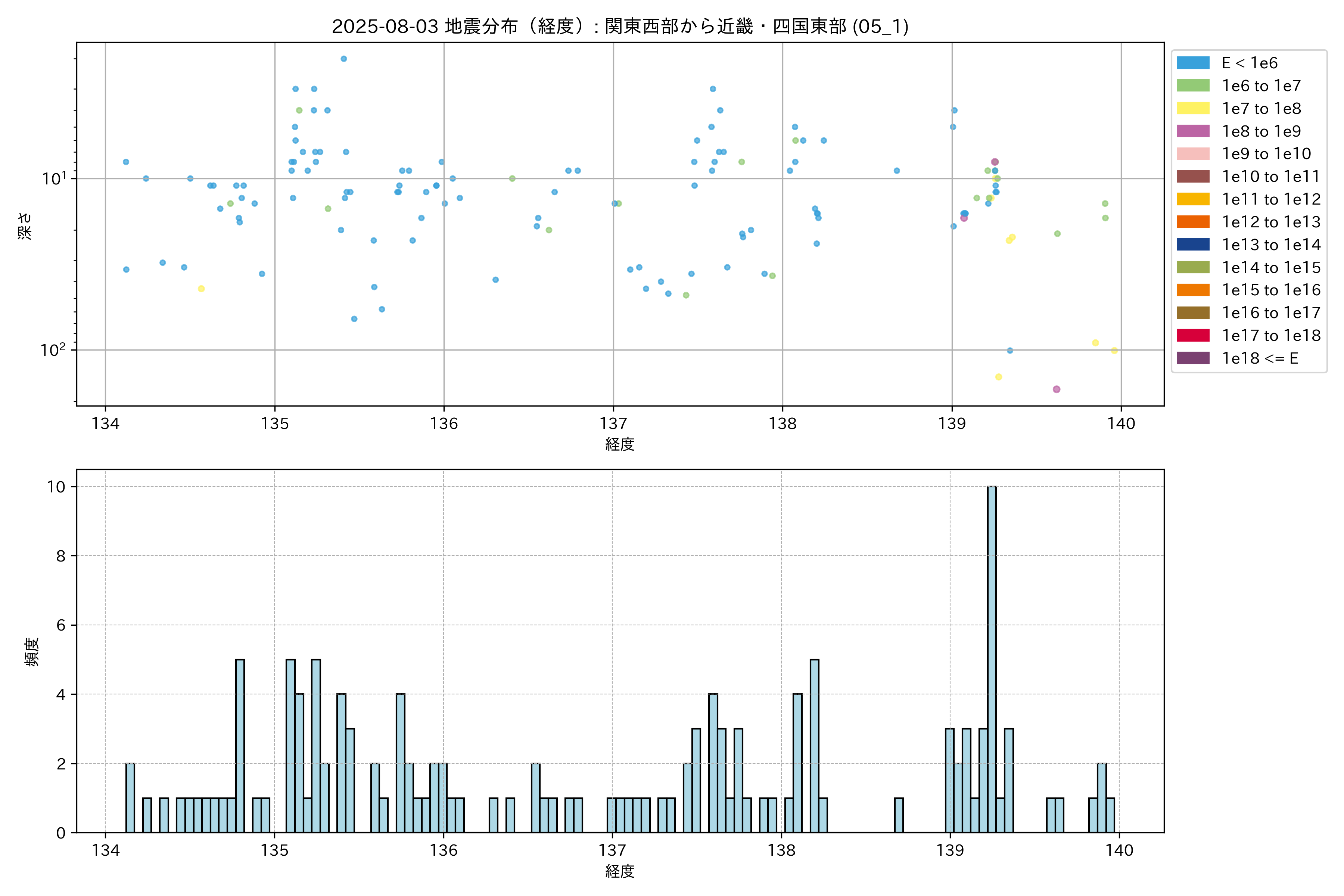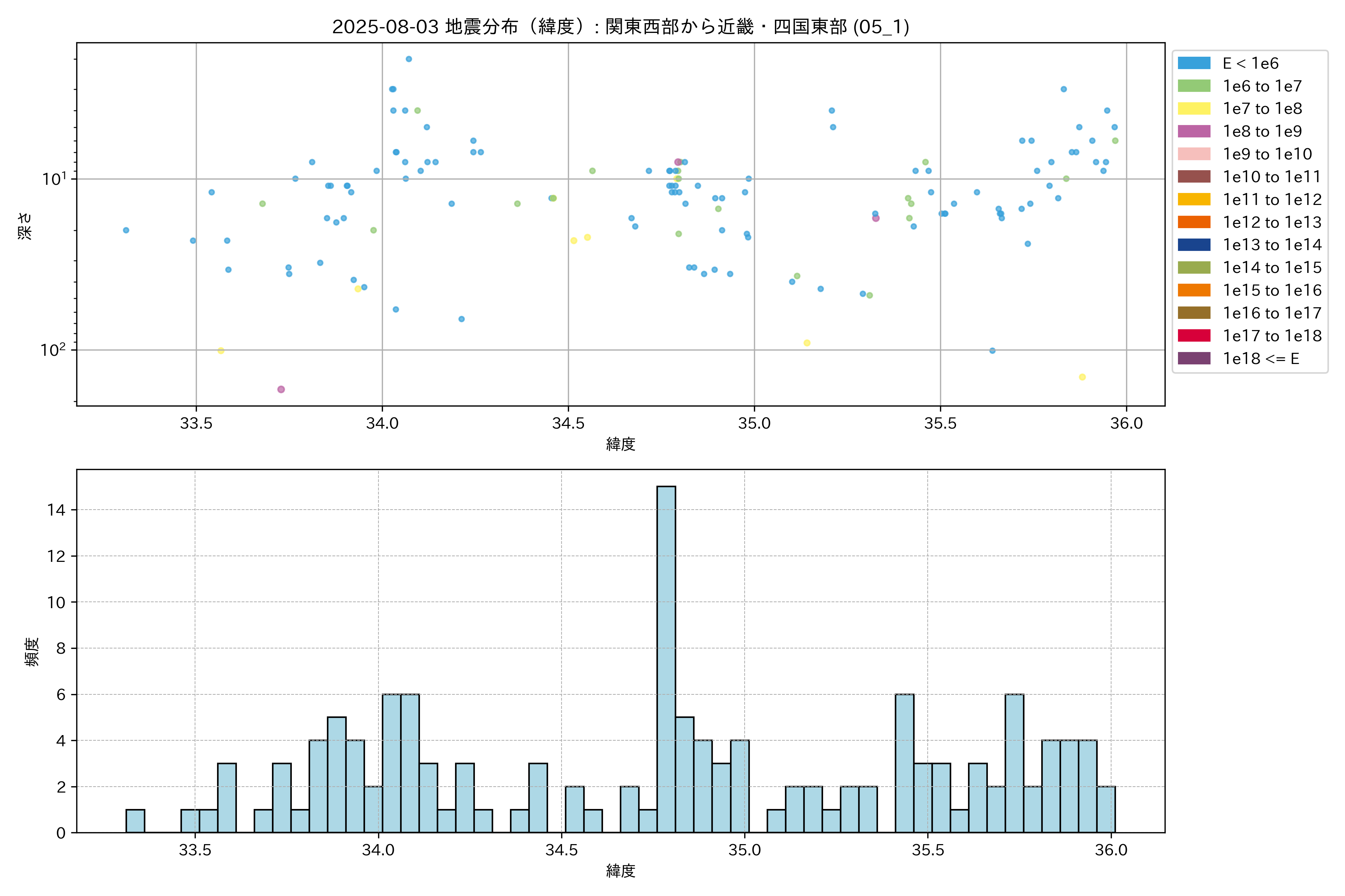 2025年08月03日 関東西部から近畿・四国東部 エリア震源マップ