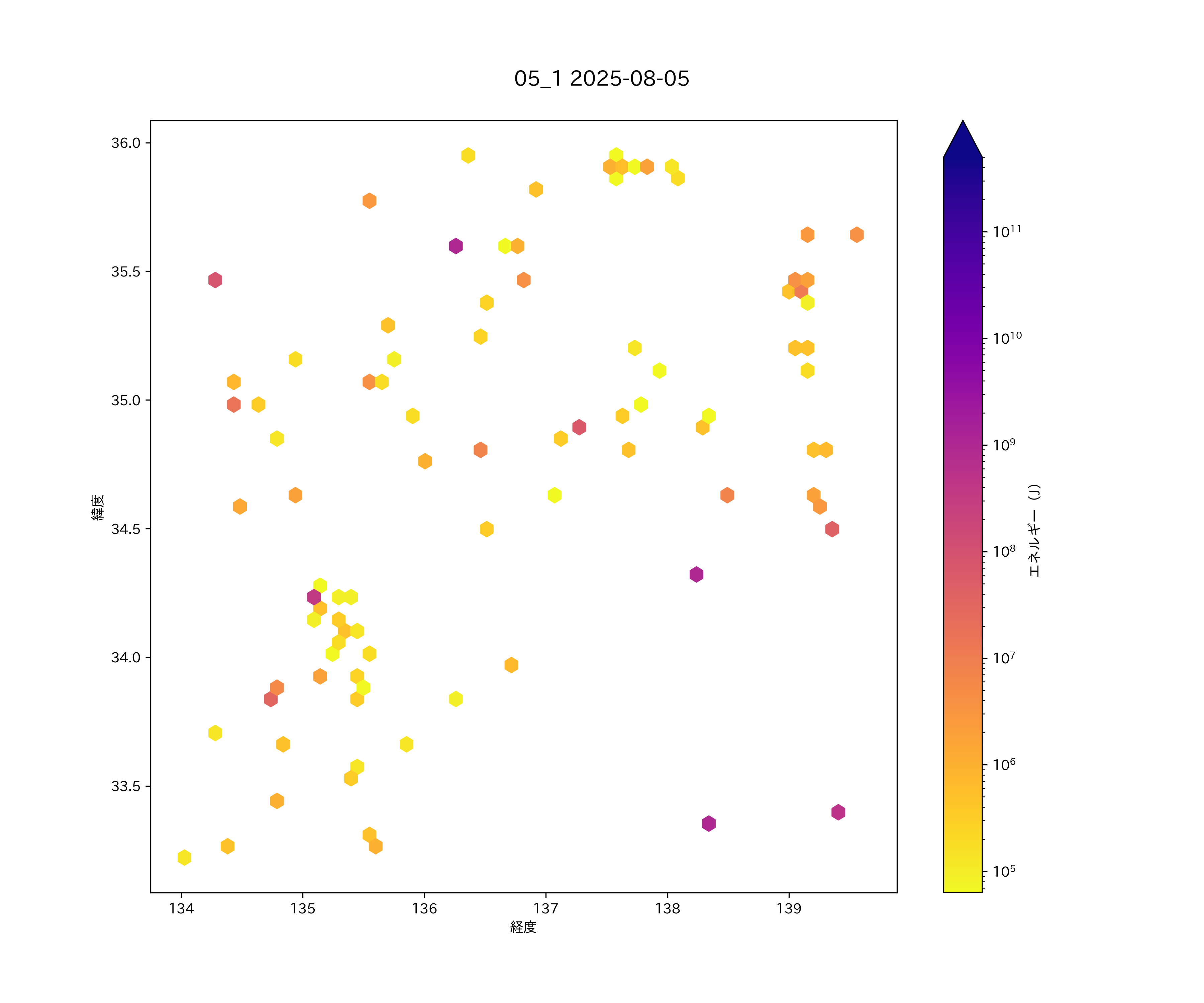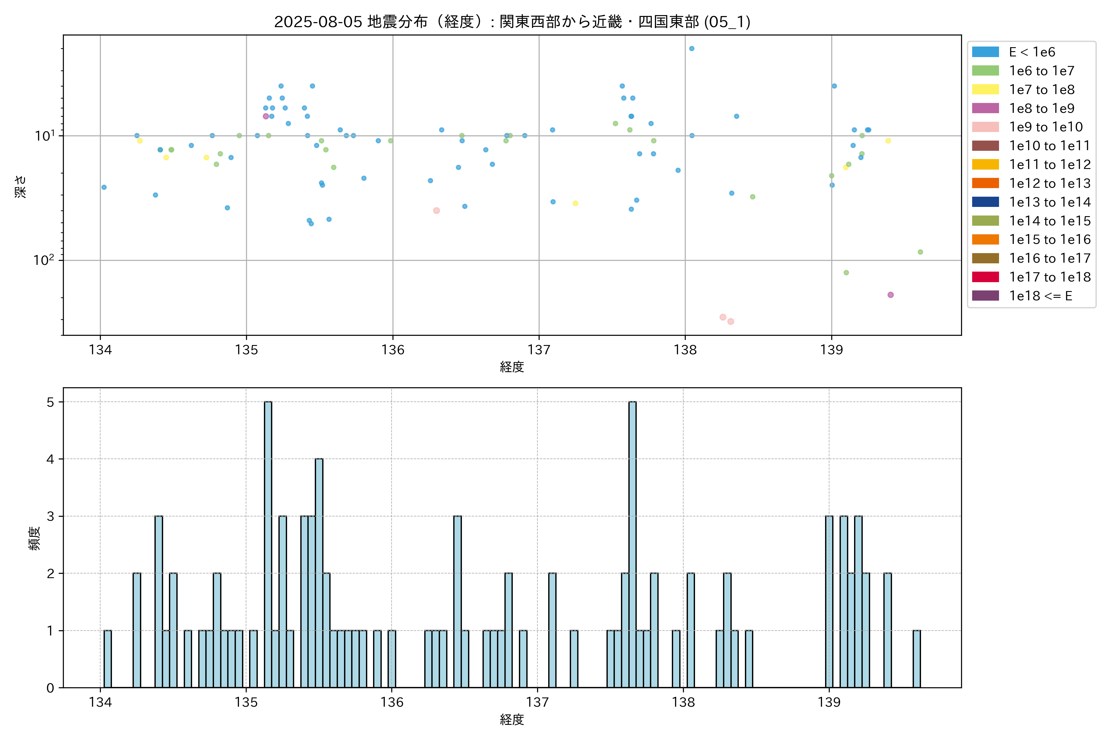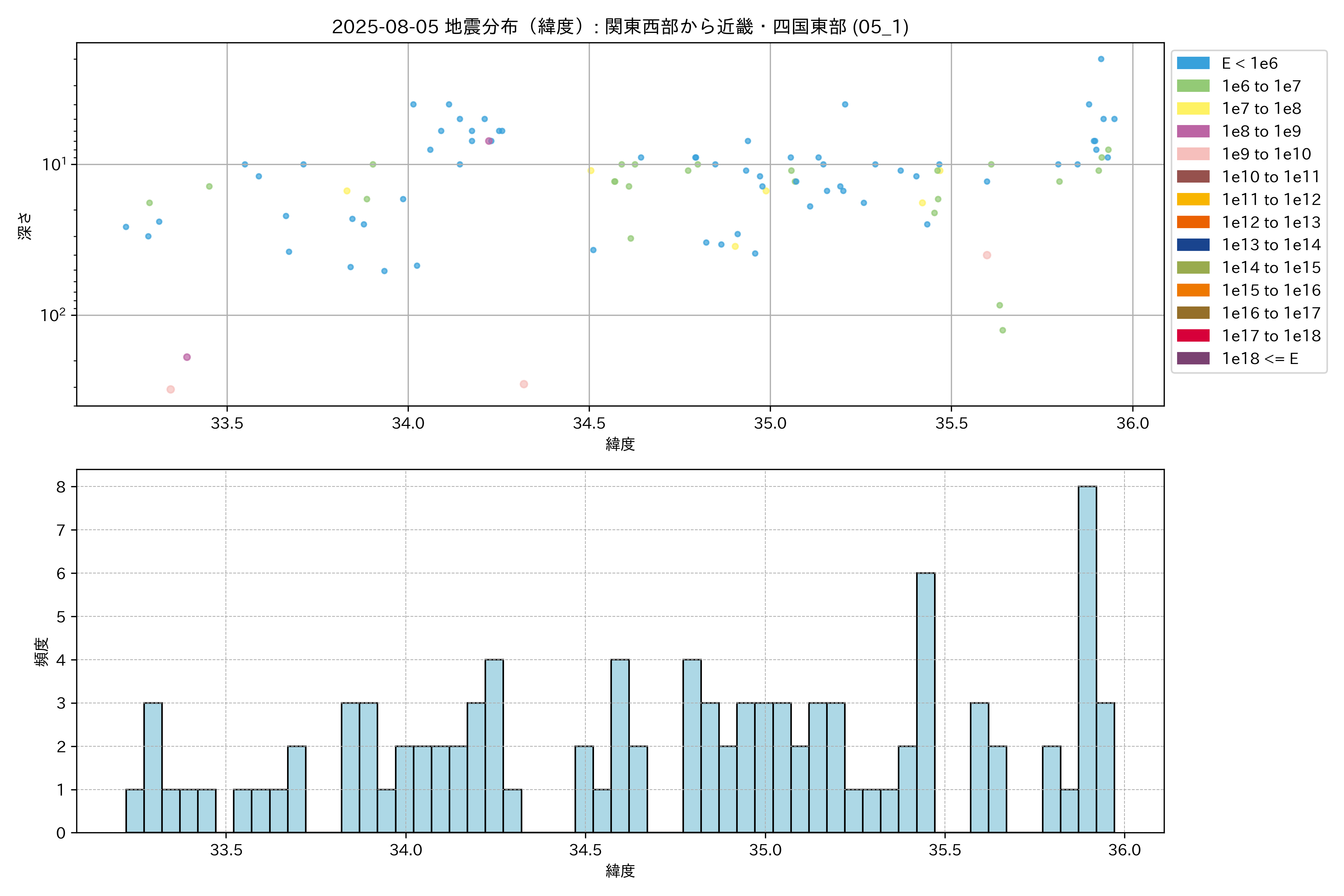 2025年08月05日 関東西部から近畿・四国東部 エリア震源マップ