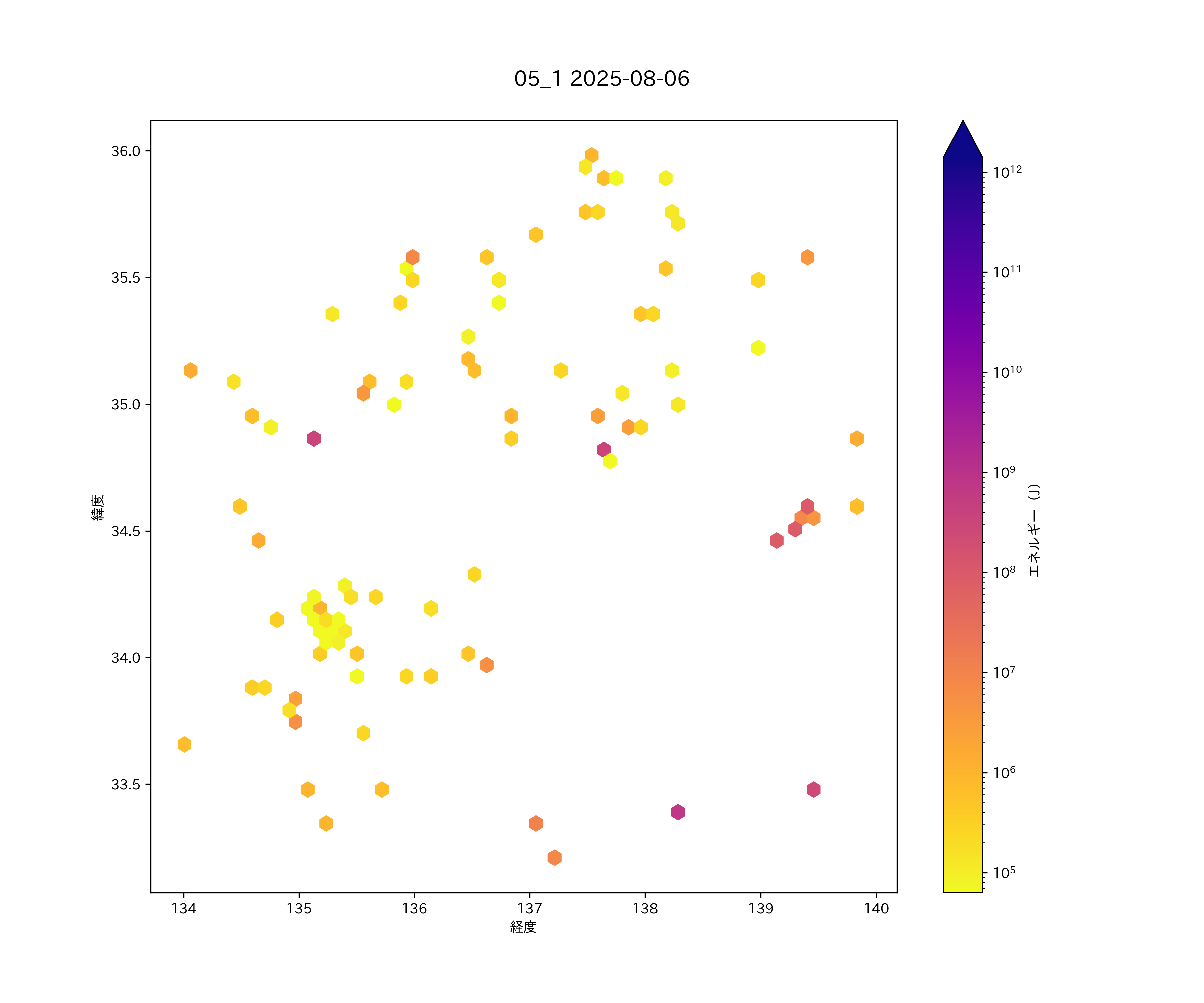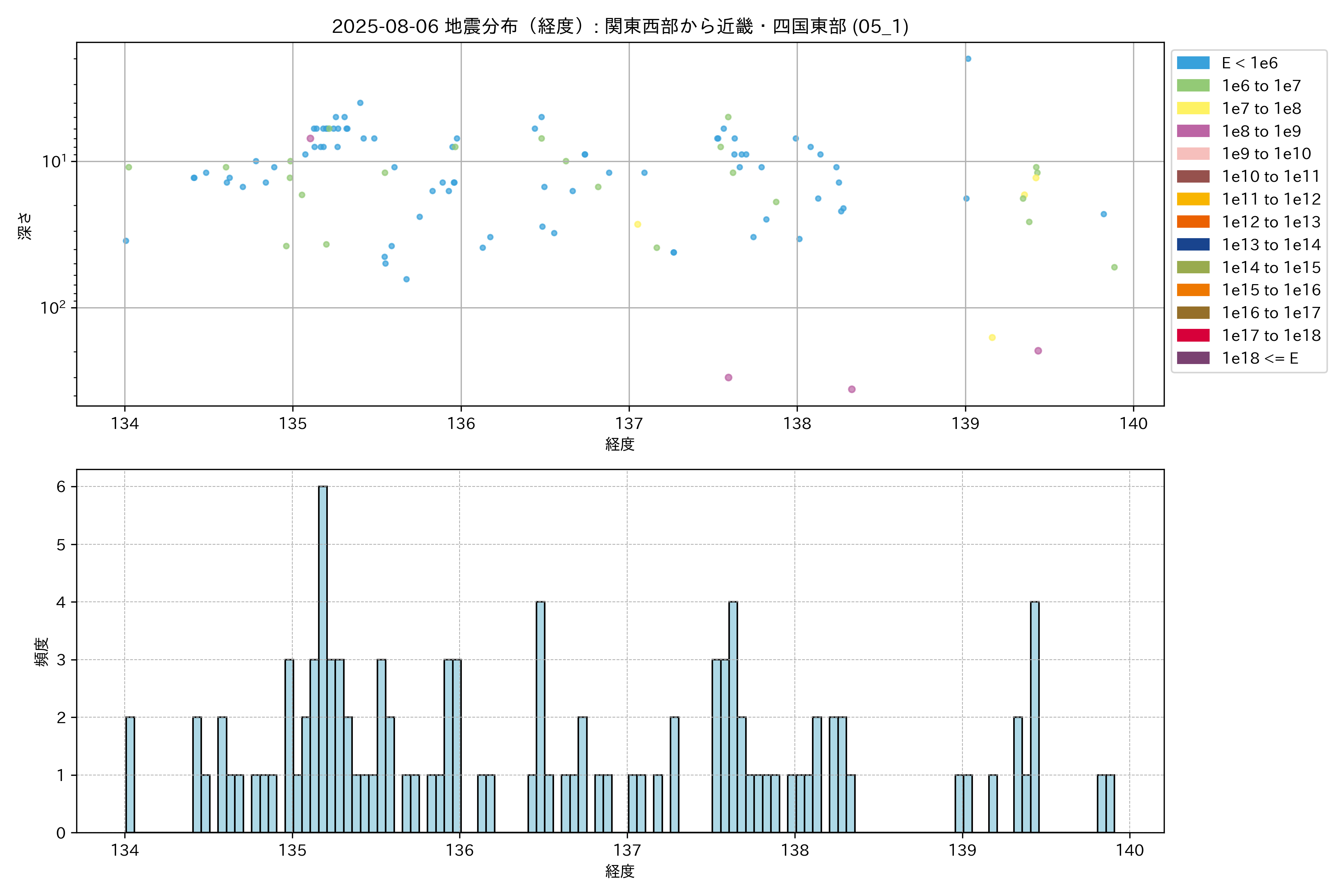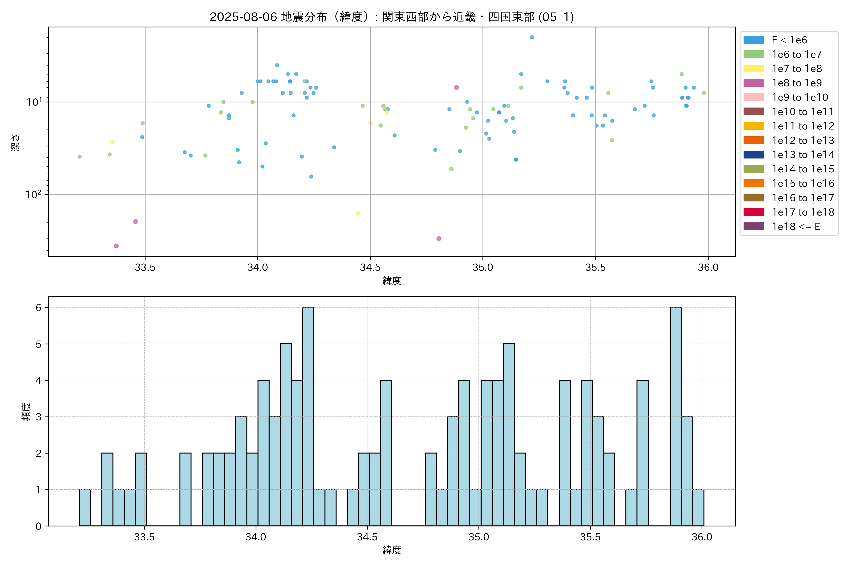 2025年08月06日 関東西部から近畿・四国東部 エリア震源マップ