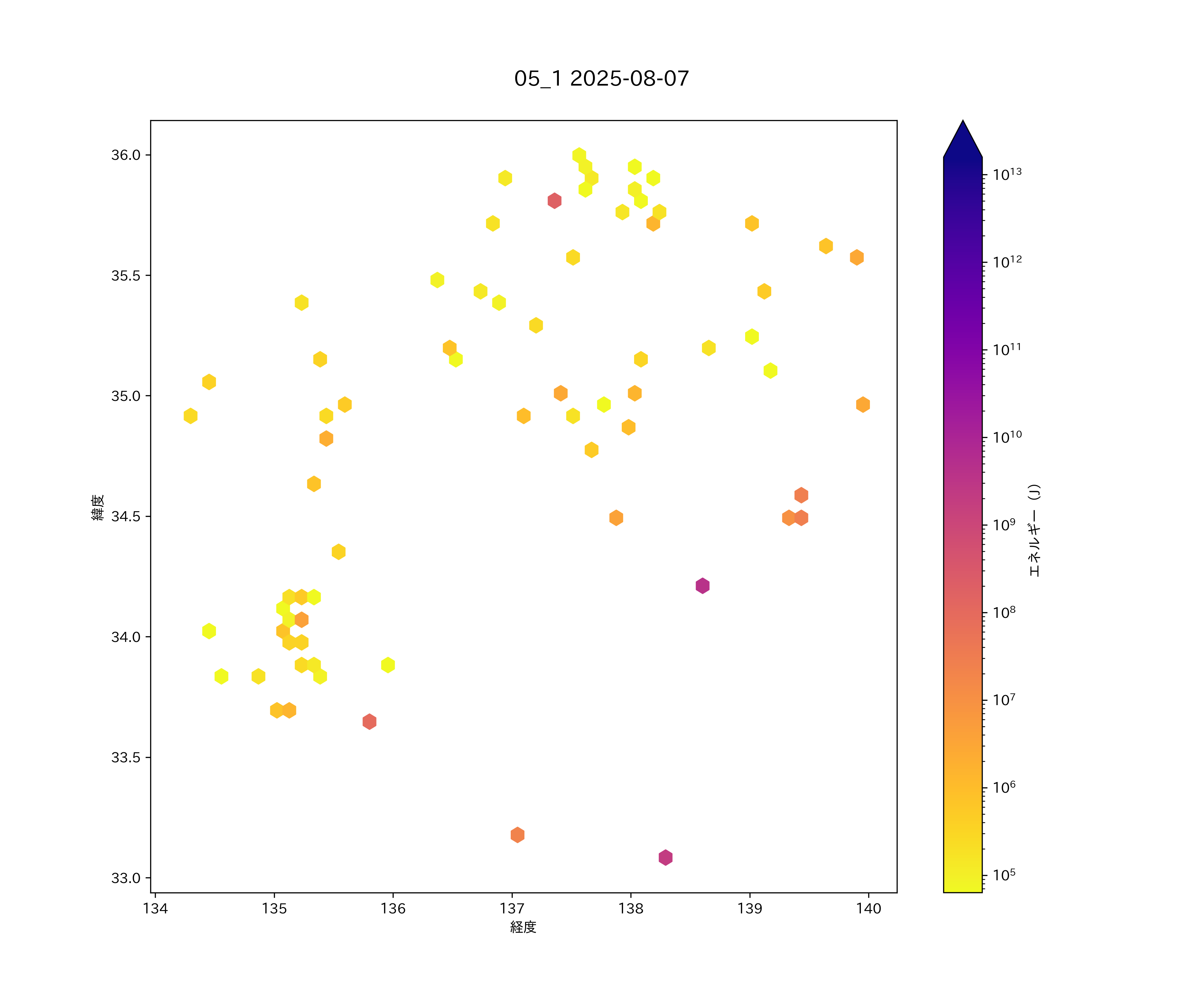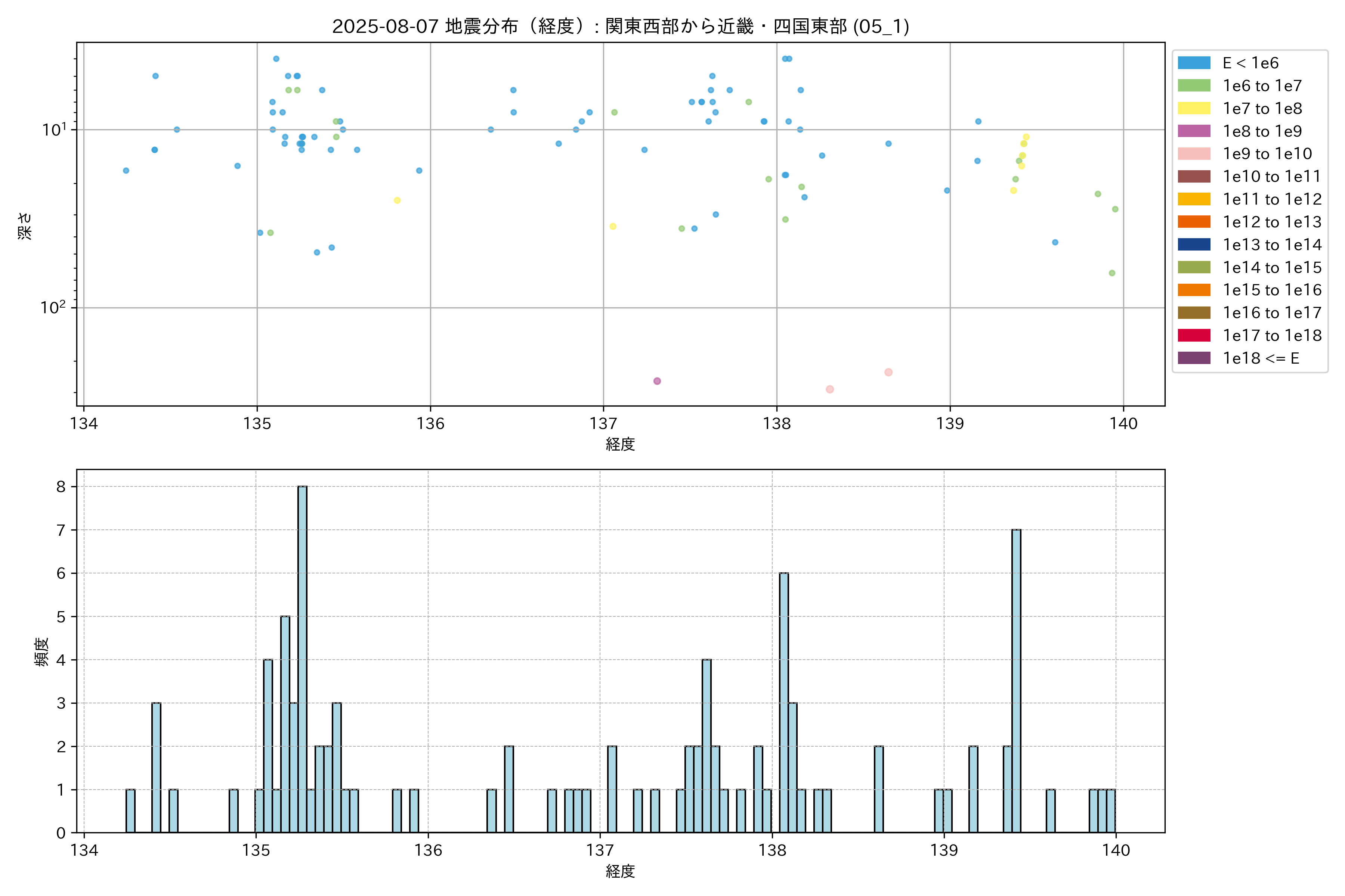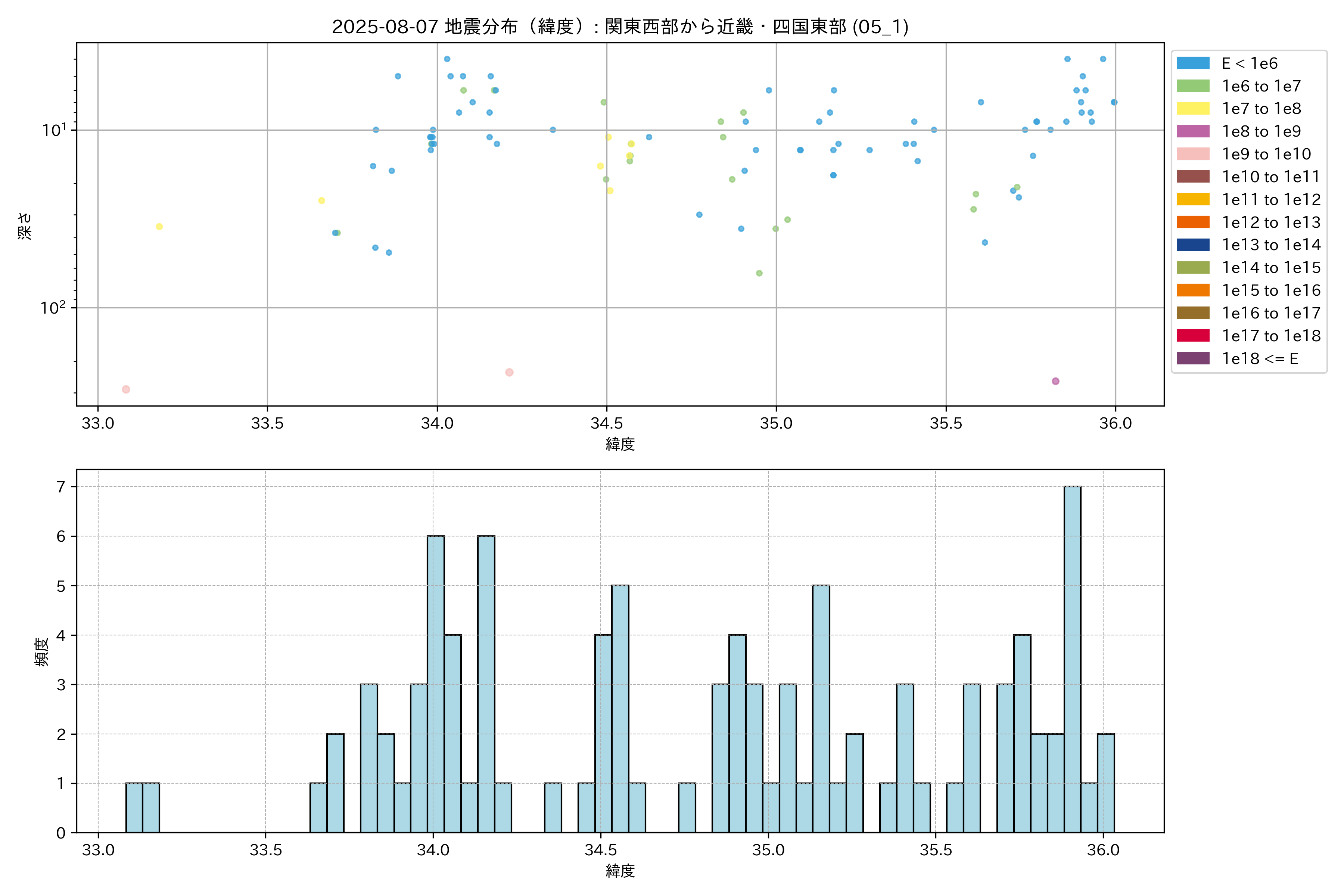 2025年08月07日 関東西部から近畿・四国東部 エリア震源マップ